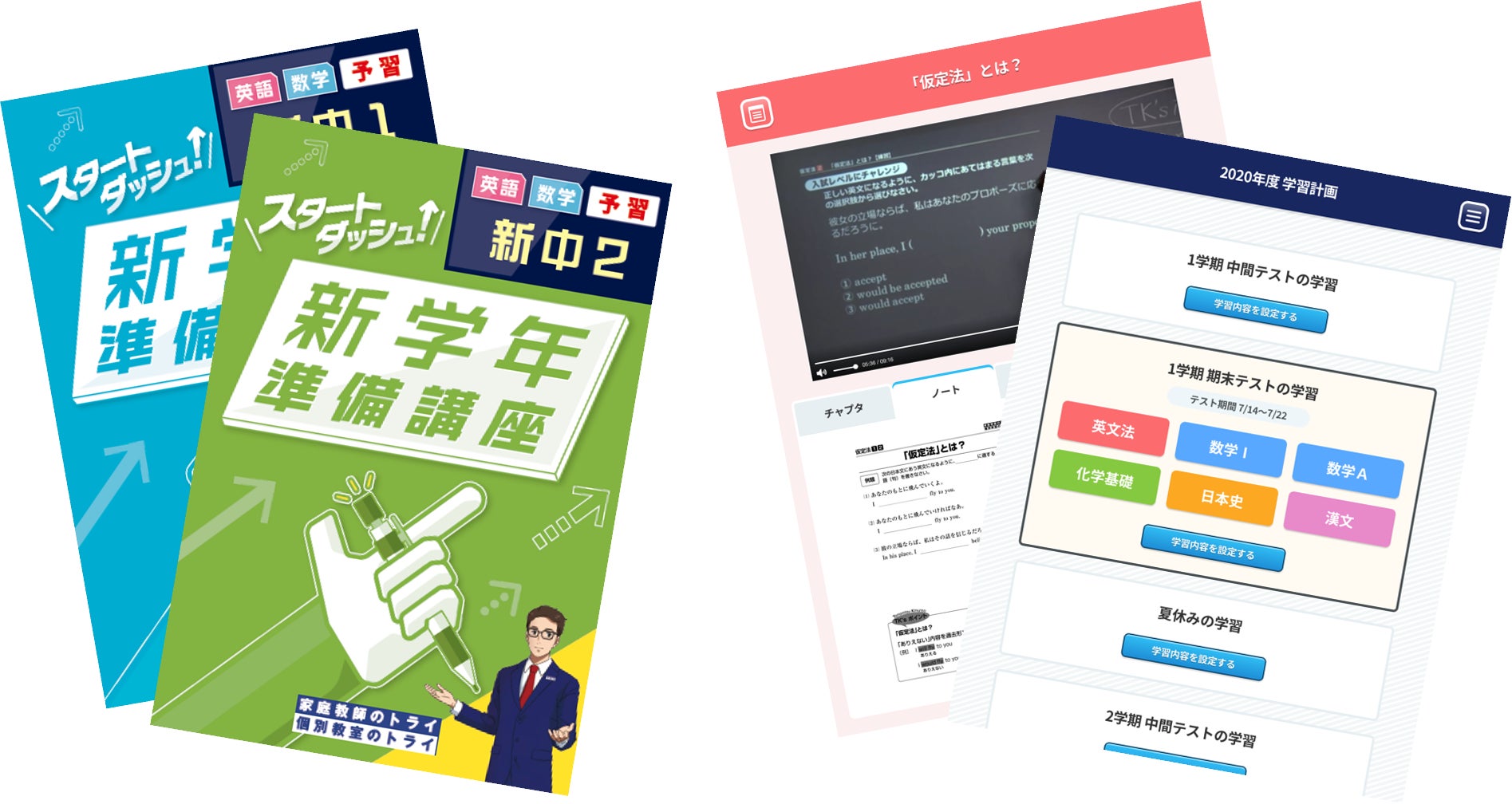 「復習・予習」スターターキットは、トライグループの学習ノウハウを活かして制作した「完全オリジナル教材」と、生徒のレベルにあった学習を提示する 「トライ式AI教材」の2つをセットで無料プレゼント。