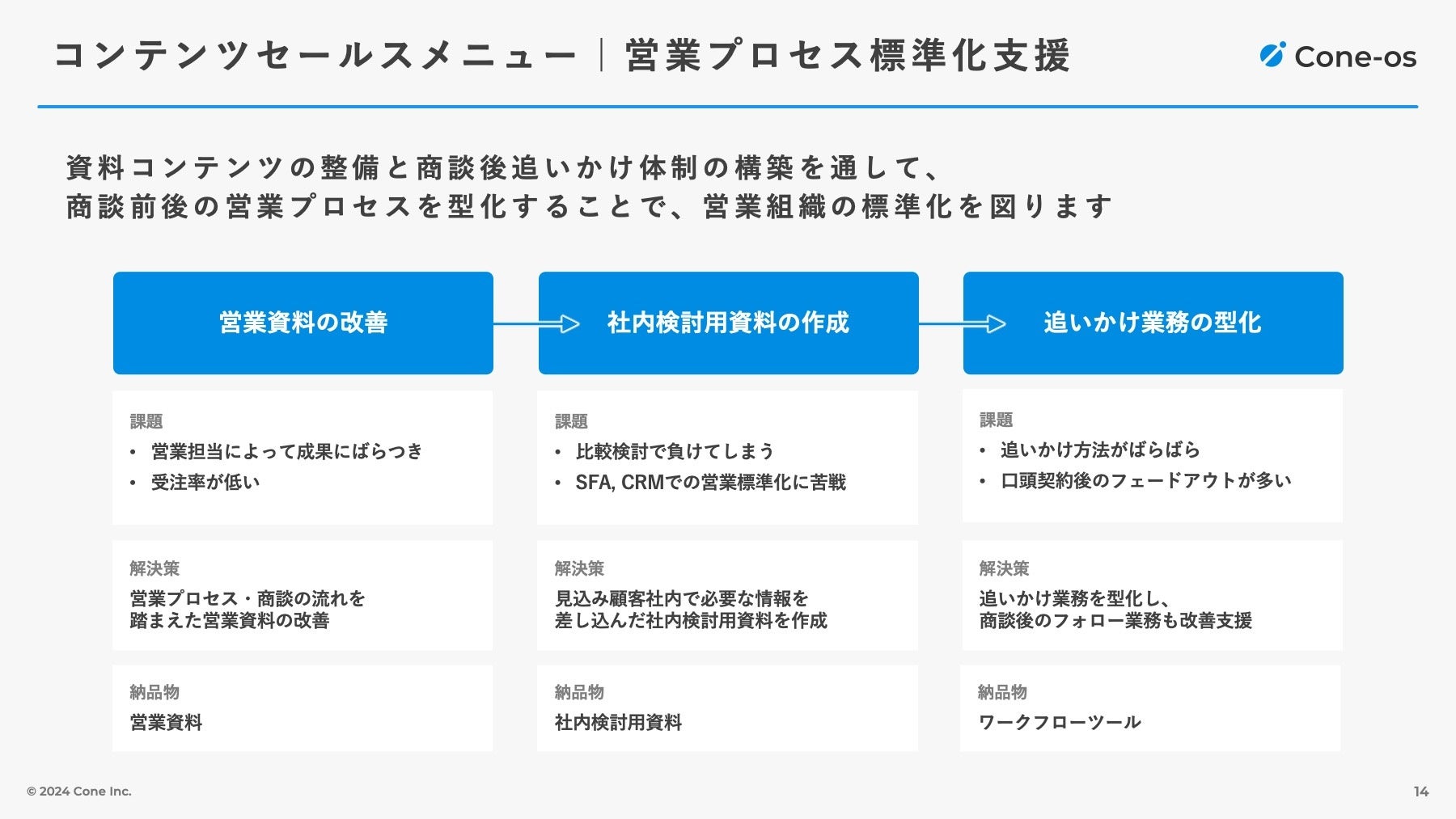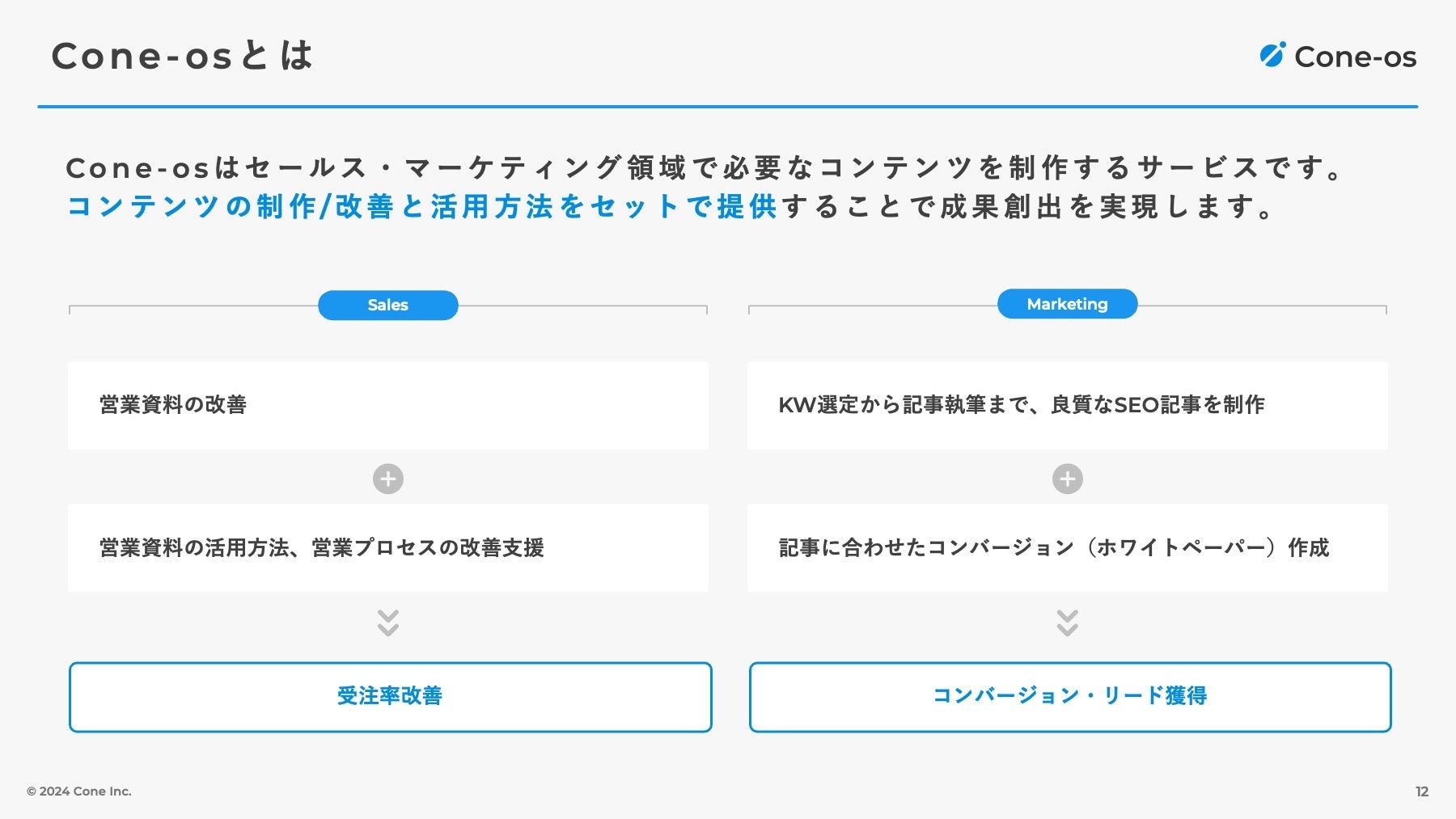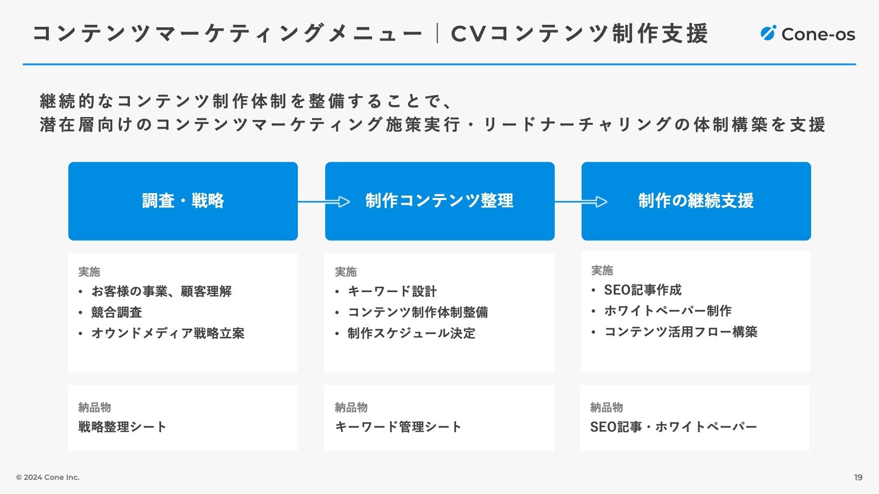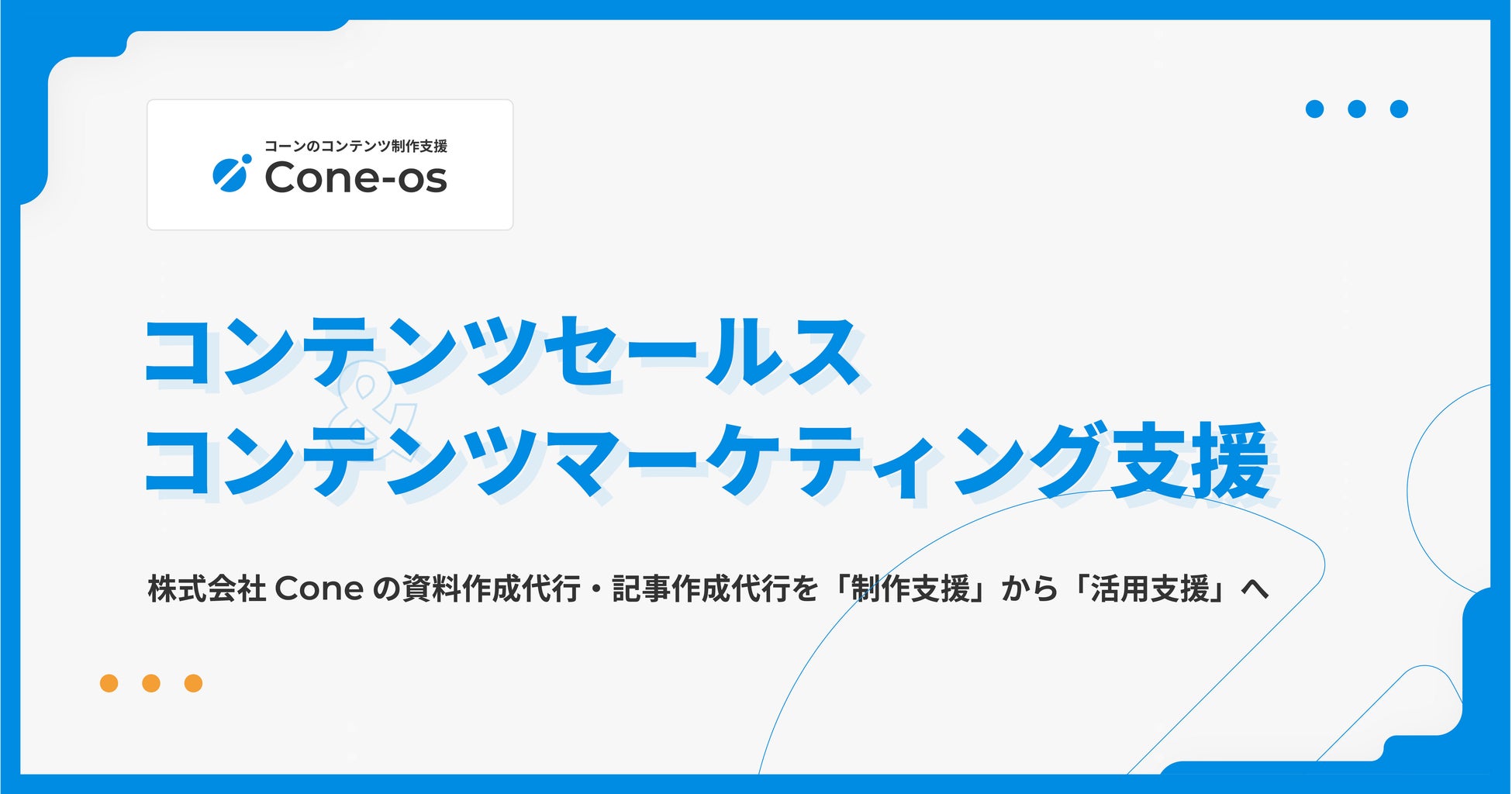 株式会社Cone(本社:大阪府大阪市、代表取締役:佐藤 立樹、以下「当社」)は、BtoBコンテンツセールス・マーケティング支援サービスをリリースしたことをお知らせします。資料作成代行サービス・記事作成代行サービスの対応範囲を「制作支援」を「活用支援」に広げてお客さまを支援します。