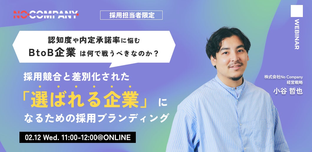 No Company、認知度や内定承諾率に悩む採用・人事向けイベント「他社ではなく自社が選ばれる企業の秘訣とは?BtoB企業が実践すべき、採用ブランディング戦略」を2月12日(水)に開催