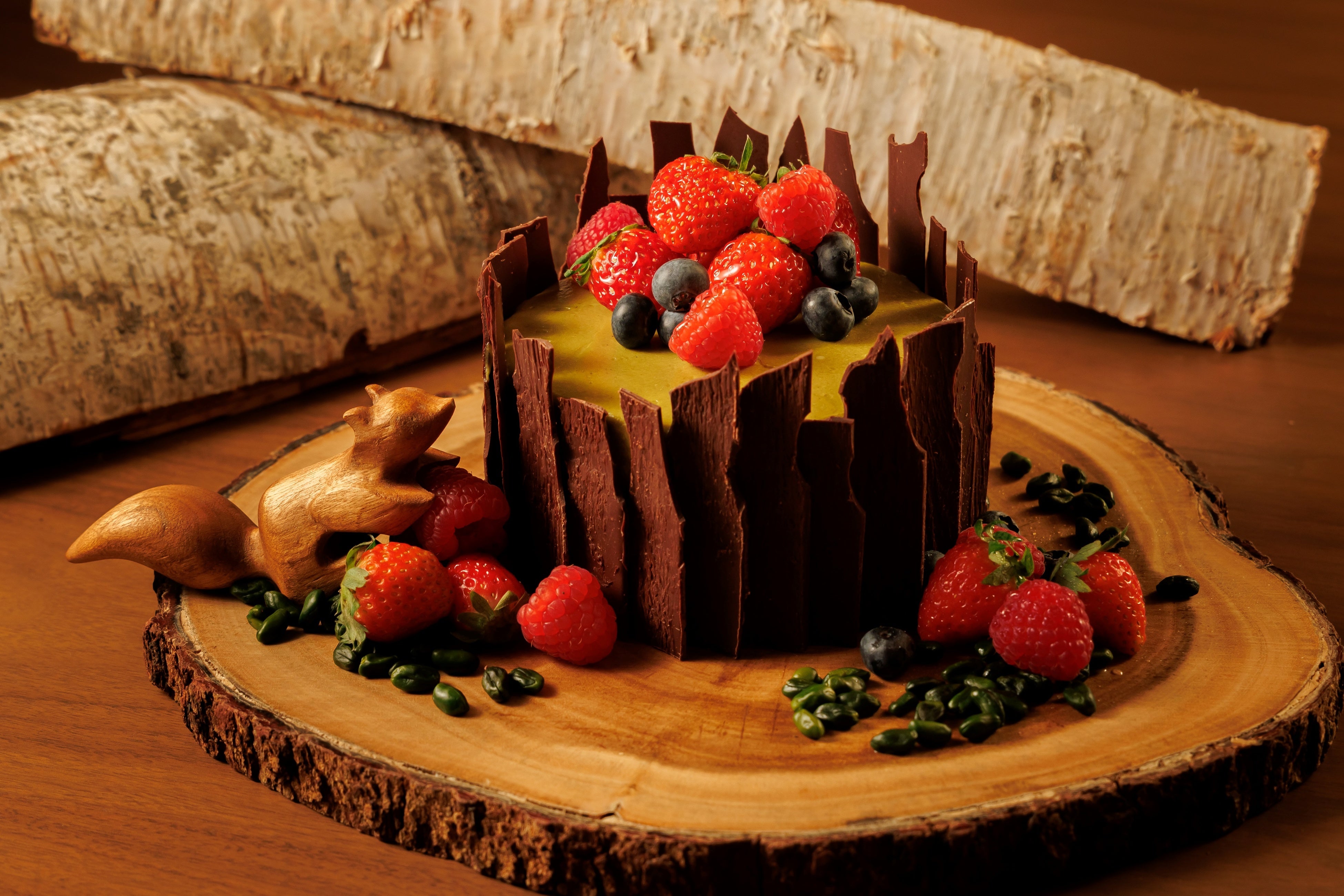 から着想を得たブッシュ・ド・ノエル。ふんわりと口溶けするカカオのスポンジ生地に、濃厚なピスタチオクリームと、甘酸っぱいアマレナチェリーを忍ばせた、贅沢な味わいの一品です。シェフ・パティシエのこだわりは、アマレナチェリー。アマレナチェリーとは、イタリアのお菓子に欠かせないチェリーのシロップ漬けで、苺とは異なる絶妙な酸味と、独特な甘み、深紅色の美しい粒が特徴です。トッピングにはブルーベリーとラズベリーを添え、華やかに彩りました。一般的なブッシュ・ド・ノエルは、切り株を横に倒したような見た目のものが多いですが、木口を上にしたデザインもシェフ・パティシエの個性が光るポイントです。「KAGARIBI」オリジナルのブッシュ・ド・ノエルを囲んで、心温まるひとときをお過ごしください。