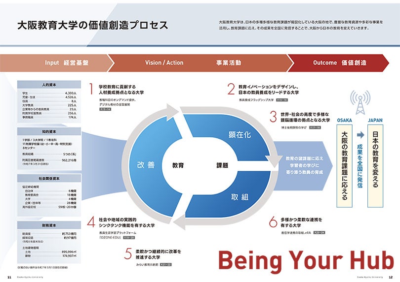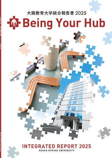 国立大学法人大阪教育大学は、2025年11月27日(木)に、「大阪教育大学 統合報告書2025」を発行しました。本学4冊目となるこの統合報告書(*)は、「Being your Hub」をキャッチコピーに制作し、本学のビジョンや戦略、取組などをよりわかりやすくお伝えし、ステークホルダーのみなさまにこれまで以上に本学の魅力を知ってもらうことで、教育研究活動にご理解・ご協力をいただきたいという趣旨で作成しました。キャッチコピーにある「Hub」は「中心」「拠点」「結束点」を意味し、本学が教育に関するさまざまなネットワークの中心的な結び目となり、大阪から日本の教育を変えていきたいという思いを込めています。