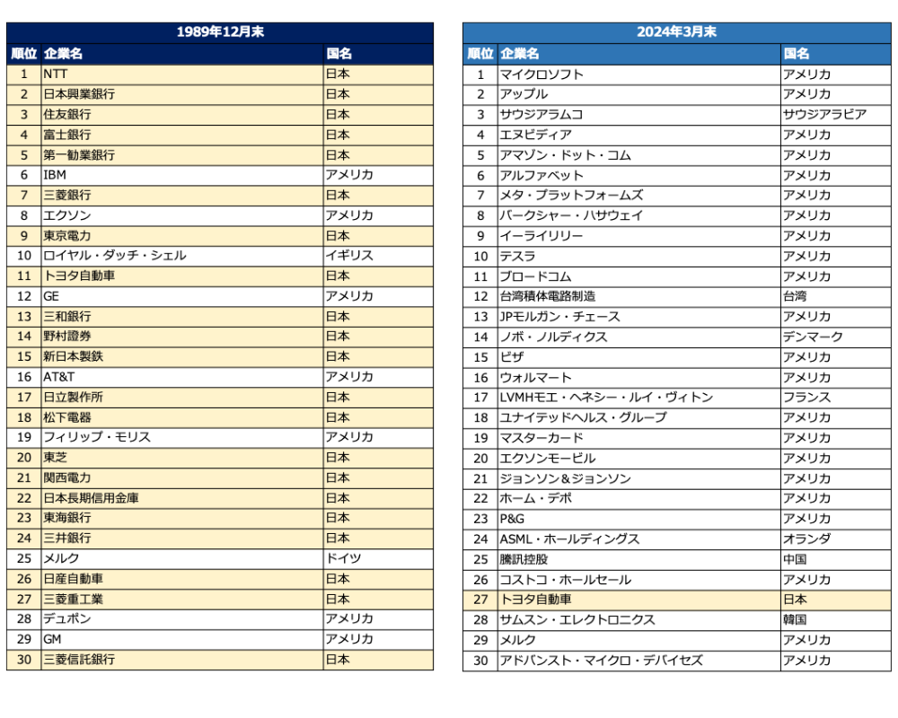 しかし、2024年現在、世界の時価総額ランキングTop30に日本企業の名前は1社だけです。