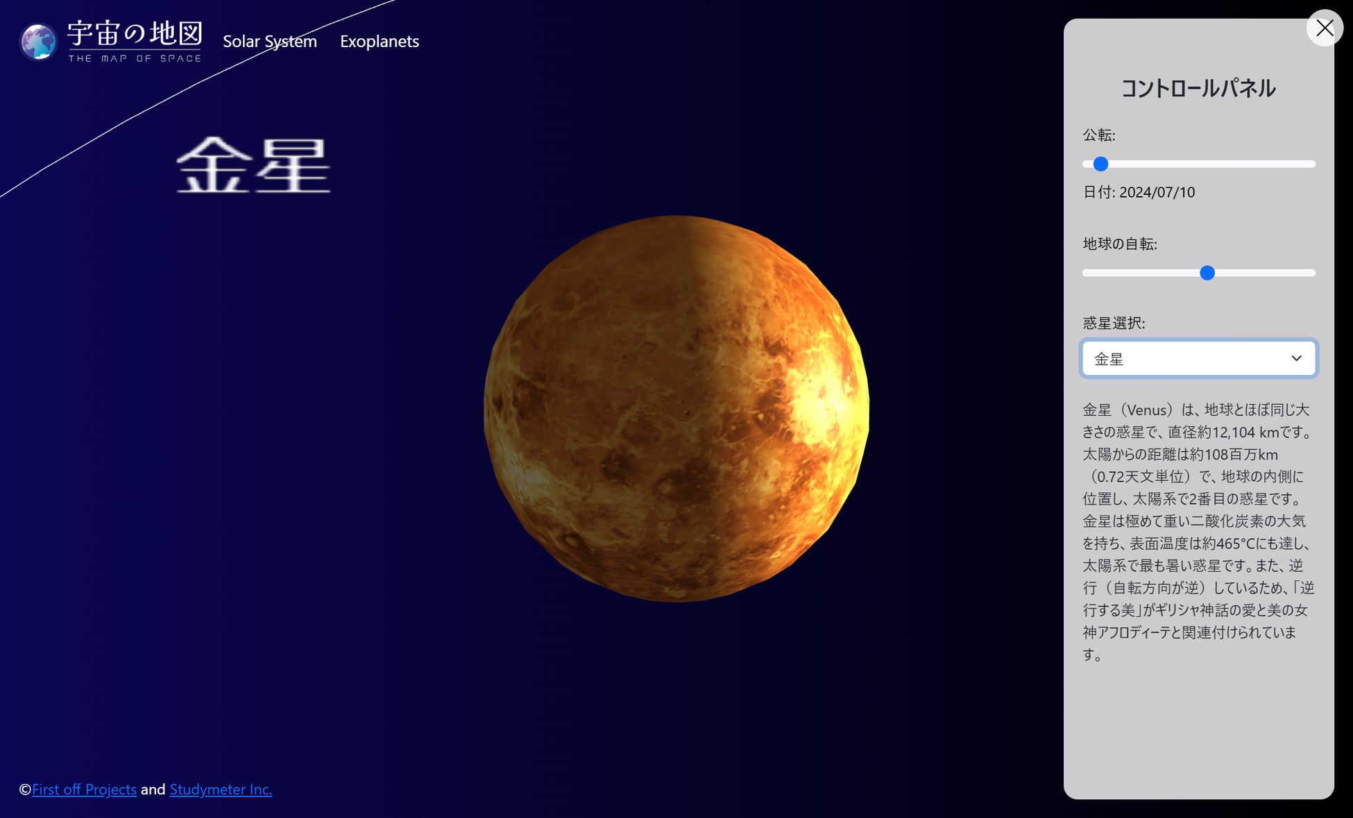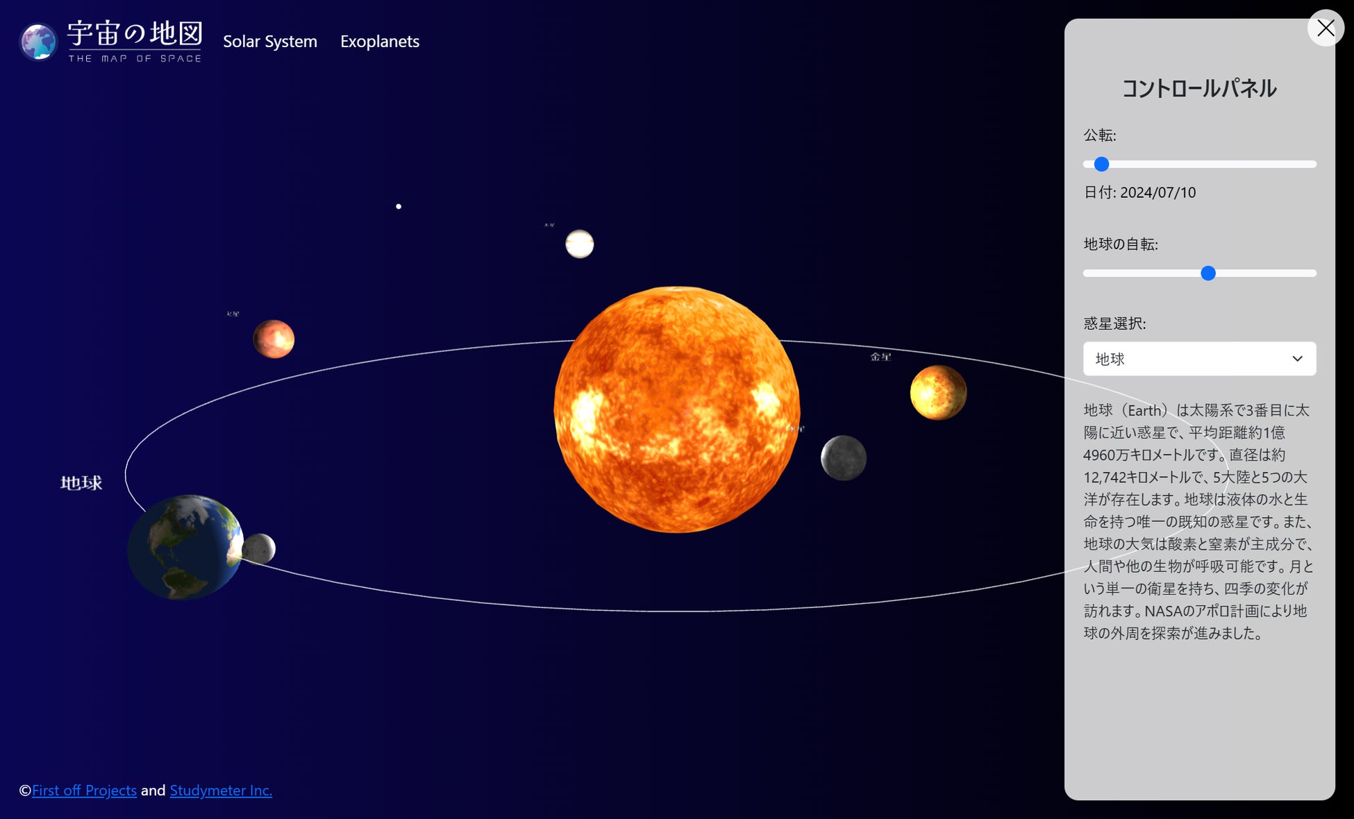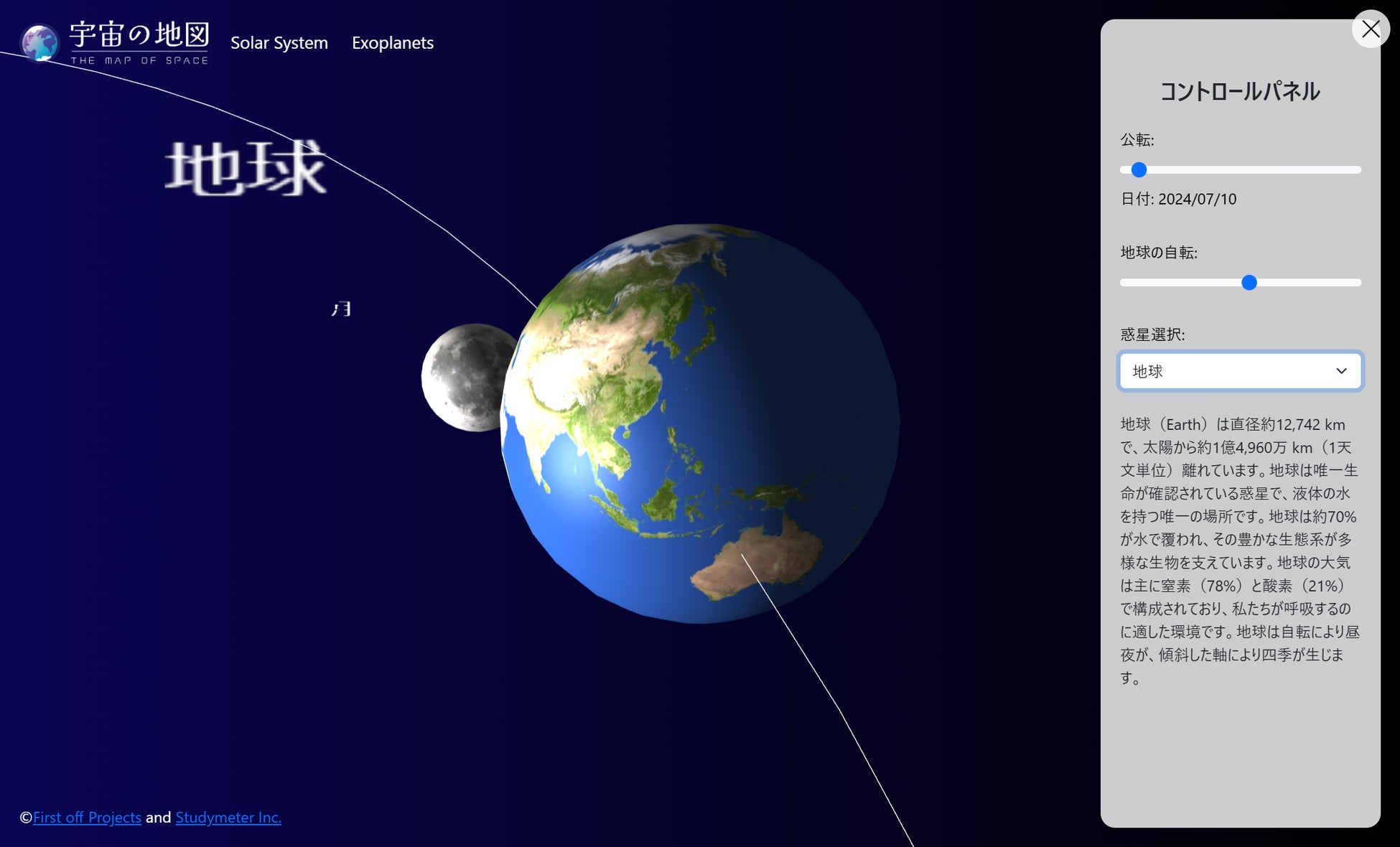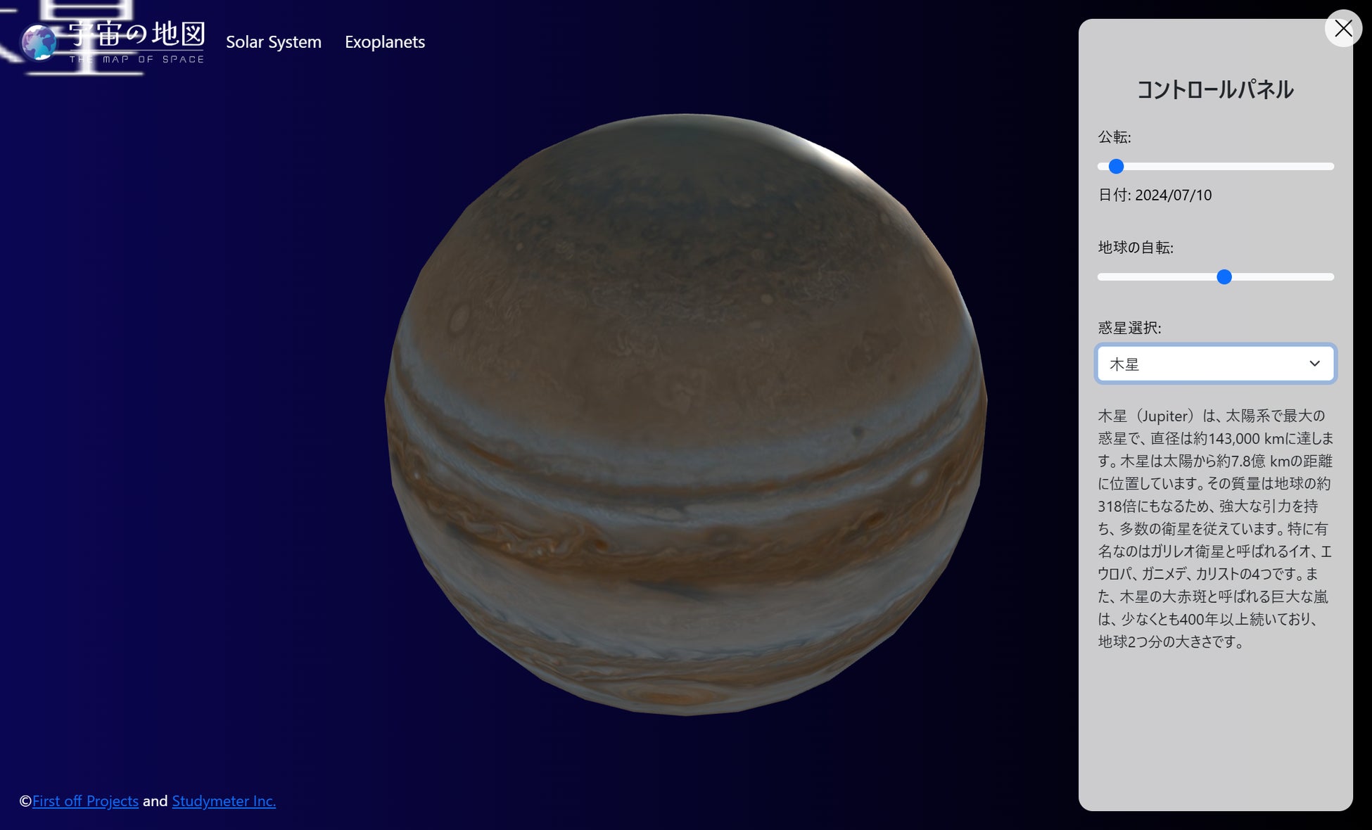 この地図では、太陽と太陽系に属する惑星が3Dマップに表示され、ユーザーは宇宙空間を探検したり、惑星の公転や地球の自転をシミュレーションすることができます。