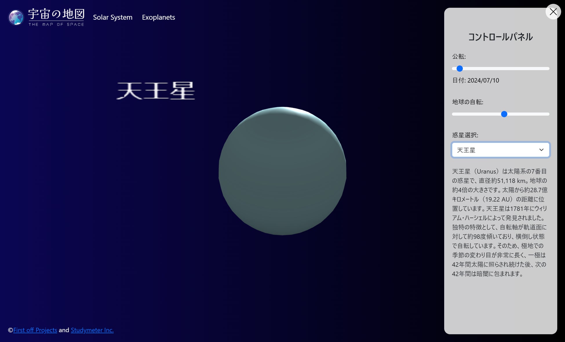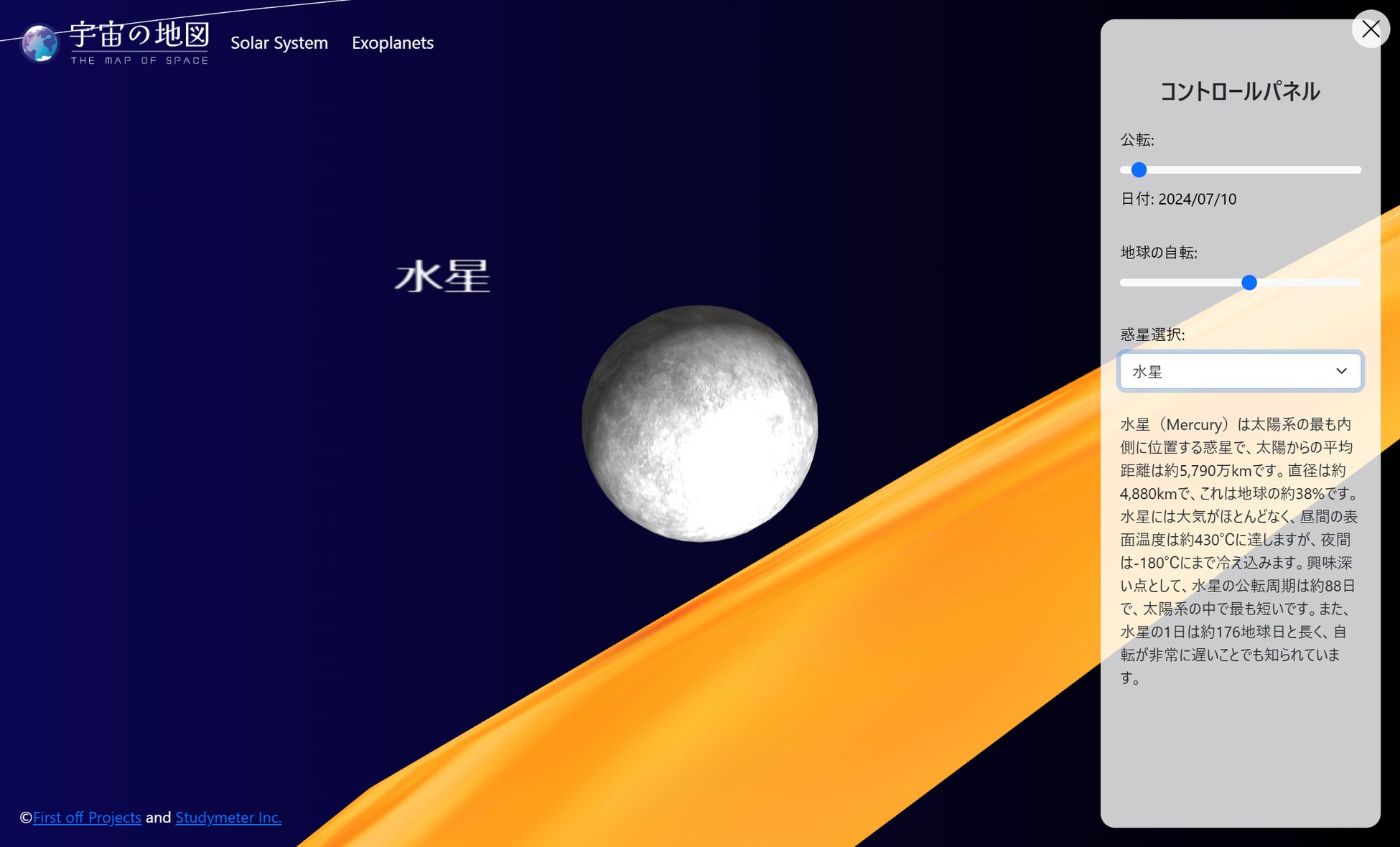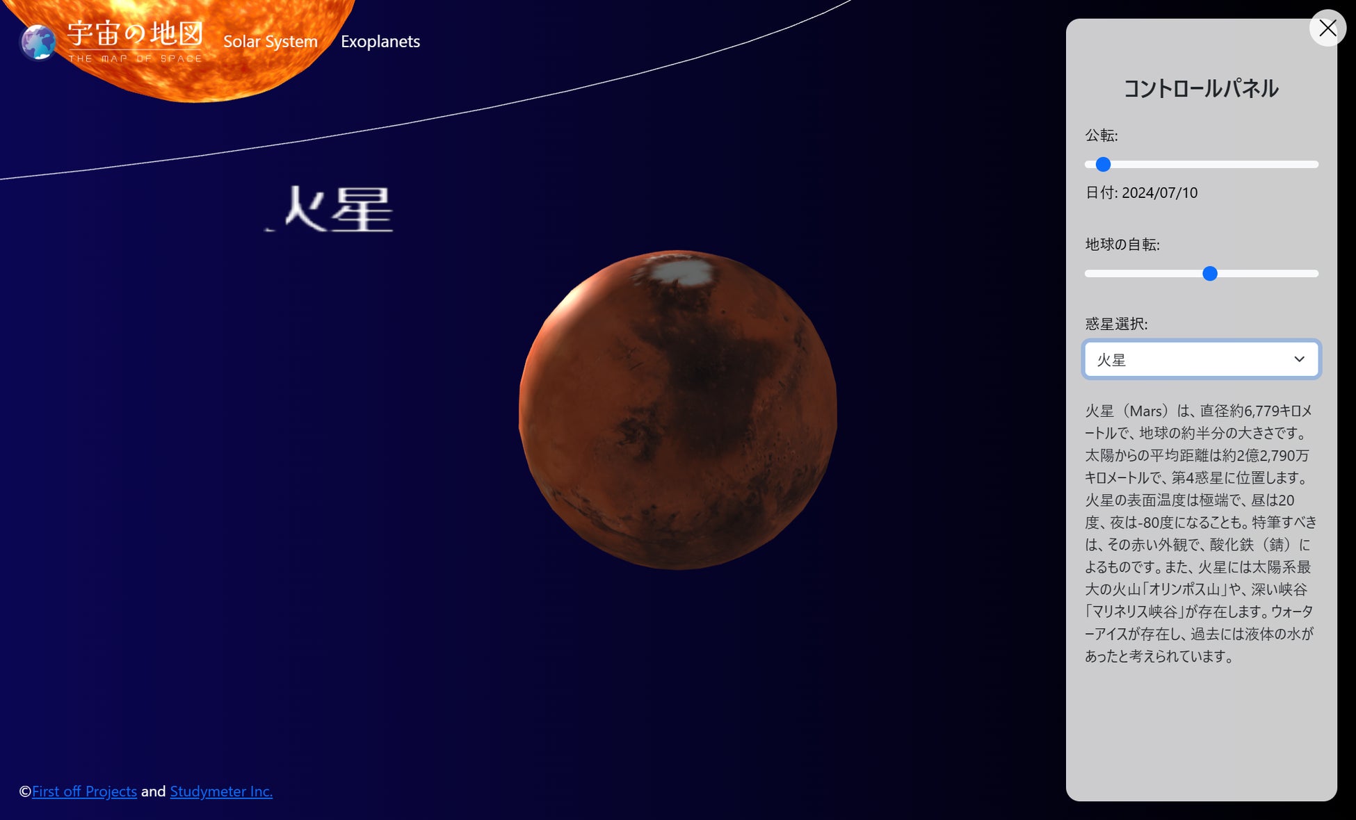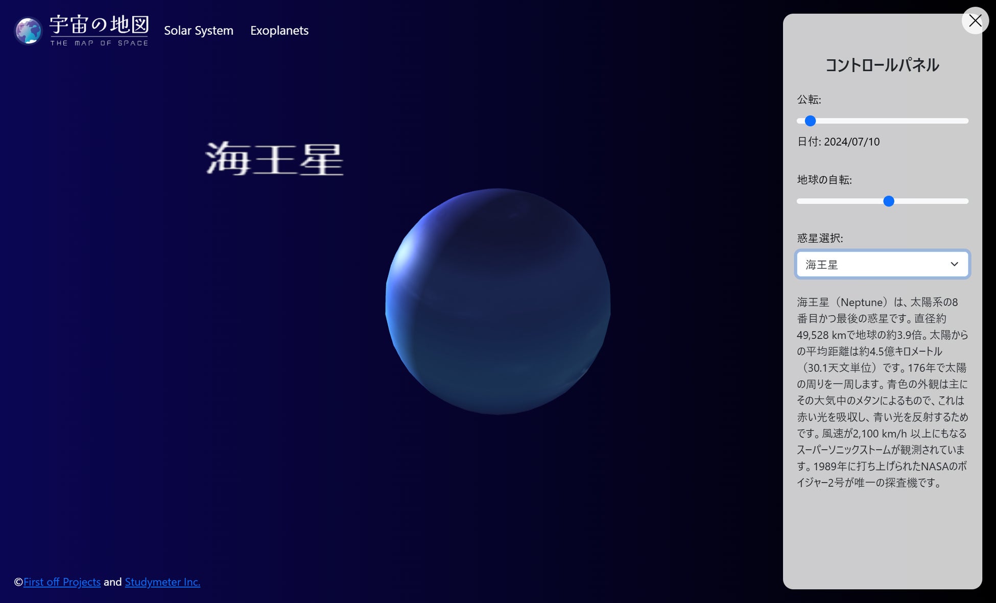 この地図では、太陽と太陽系に属する惑星が3Dマップに表示され、ユーザーは宇宙空間を探検したり、惑星の公転や地球の自転をシミュレーションすることができます。