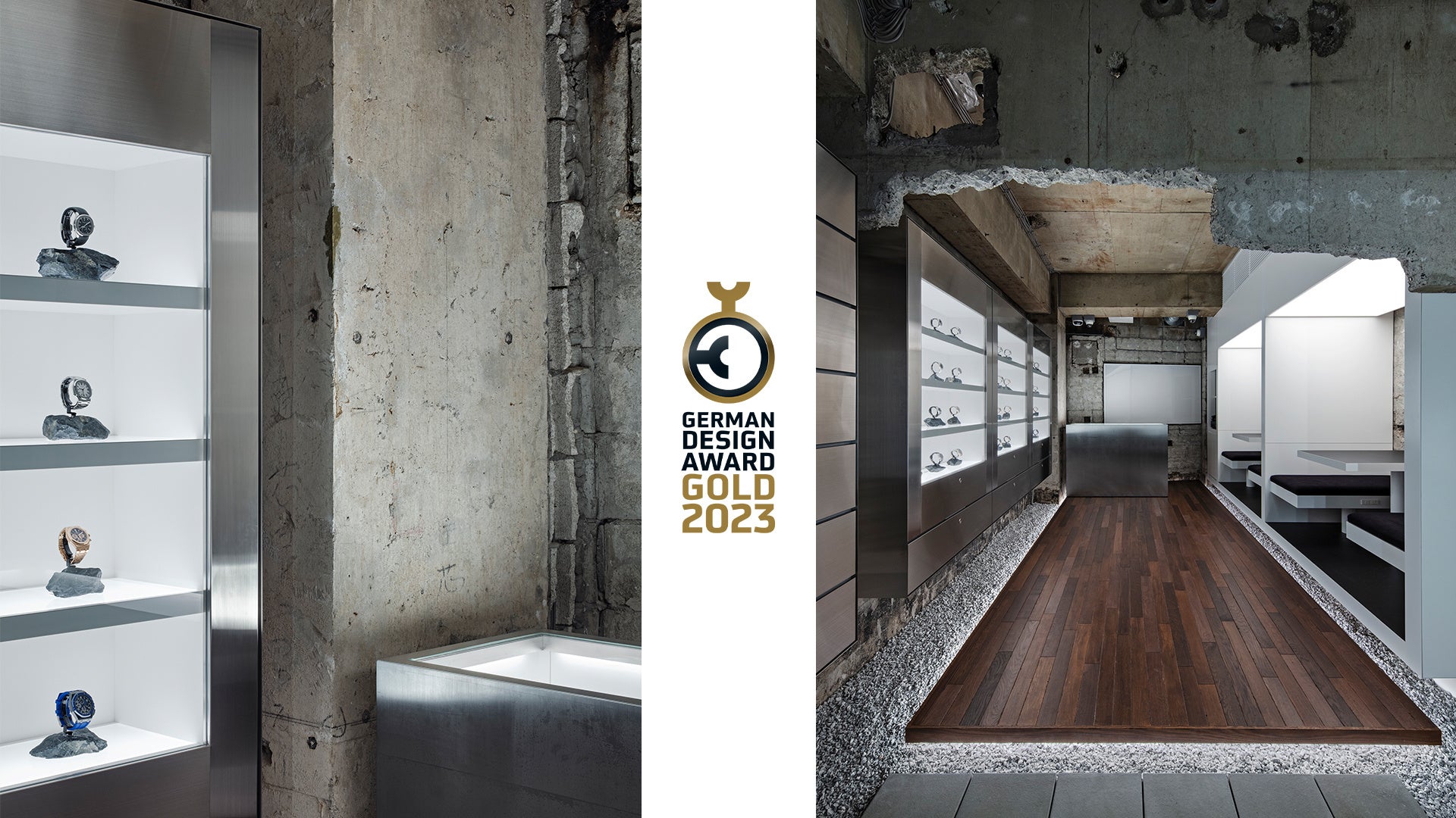 「German Design Award」では、老朽化したコンクリートの欠損部分に金継ぎを施しそのまま利用することで新たな価値を与えた点や、コンクリートの荒削りな躯体と高品質な素材で作られたミニマルで直線的なインテリアとのコントラストが評価され、今回の受賞に繋がりました。