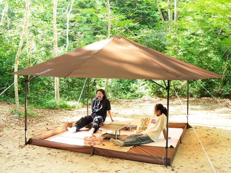 レジャーシートなどを屋根下に敷けばお座敷スタイルのピクニックも可能(DOD製品では「カマザシキM」がぴったりサイズ)。