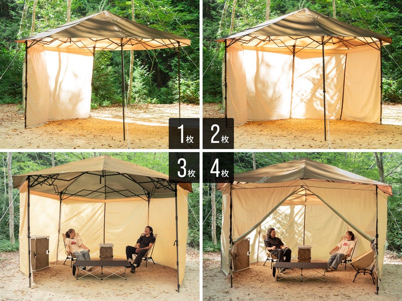 目隠しや遮光を担う「でかキノコタープ専用サイドパネル」もオプション品としてご用意しており、パネルを組み合わせることでテントのような幕内空間も作れます。
