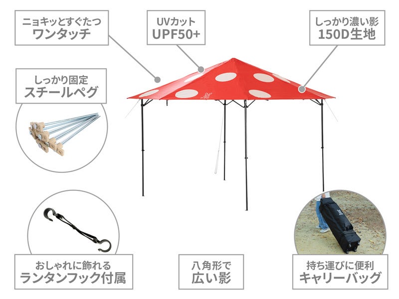 キノコをモチーフとした八角形屋根を採用することで一般的な四角形屋根のワンタッチタープと比べて影面積が広く、UVカットを施した厚みのある生地のため快適な濃い影を作り出せるのが特徴です。