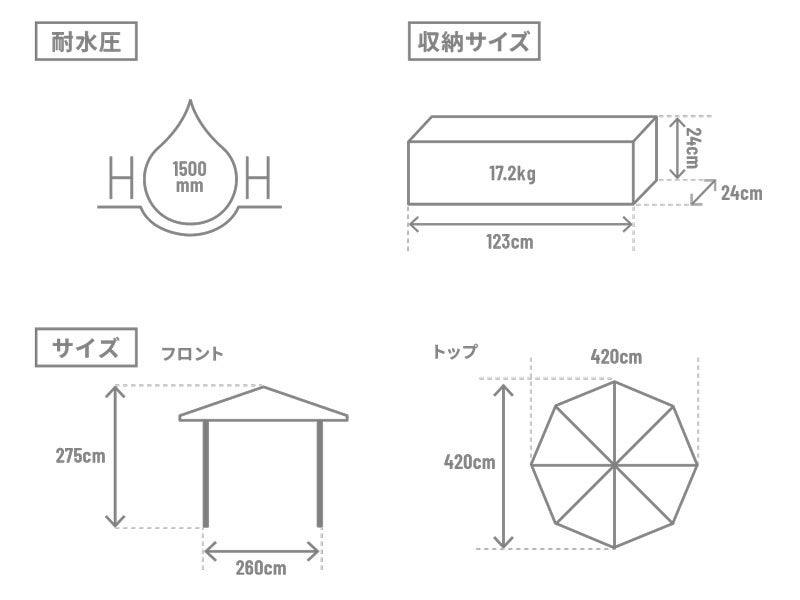 製品名:でかキノコタープ 型番・カラー:TT5-074-RD・レッド TT5-074-BR・ブラウン 販売価格(税込):19,800円 サイズ:(約)W420×D420×H185/215/245/260/275cm 収納サイズ:(約)W24×D24×H123cm 総重量:(約)17.1kg 材質:[タープ生地] 150Dポリエステル(PUコーティング、UVカット加工) [フレーム・ペグ] スチール [キャリーバッグ] 600Dポリエステル(PUコーティング) 最低耐水圧:1500mm UVカット:UPF 50+ セット内容: 製品本体(タープ生地、フレーム)、ペグ×8本、ペグ・ランタンフック用収納袋、ロープ×4本(本体に取付済)、ランタンフック×1本、キャリーバッグ その他特徴:遮光率95%以上 |