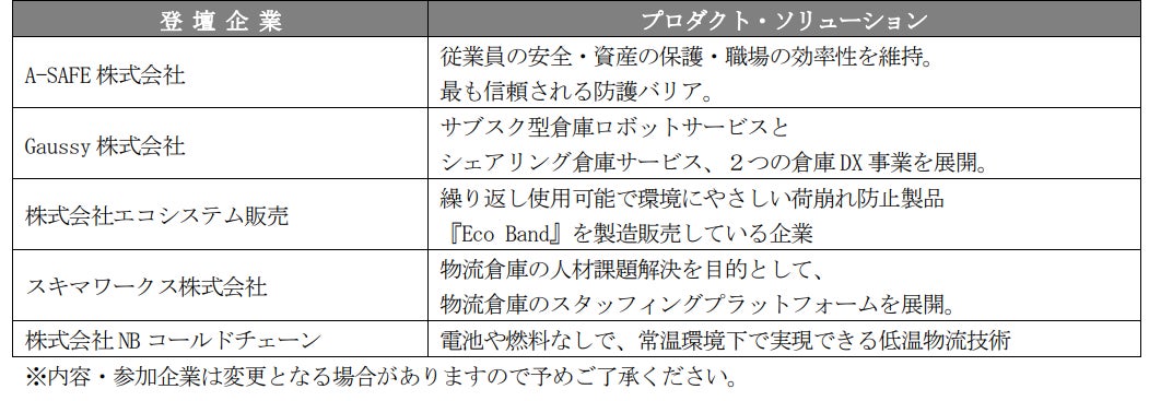 物流業界の課題を解決する物流テック企業計5社による製品・サービスを体験できます。人手不足・長時間労働等の課題を解決する効率化・省人化を始め、SDGsや低温物流技術等の多岐に渡る物流テック企業が登壇いたします。当日は各出展企業や参加者同士の交流会を実施予定のため、その場で個別相談も可能です。