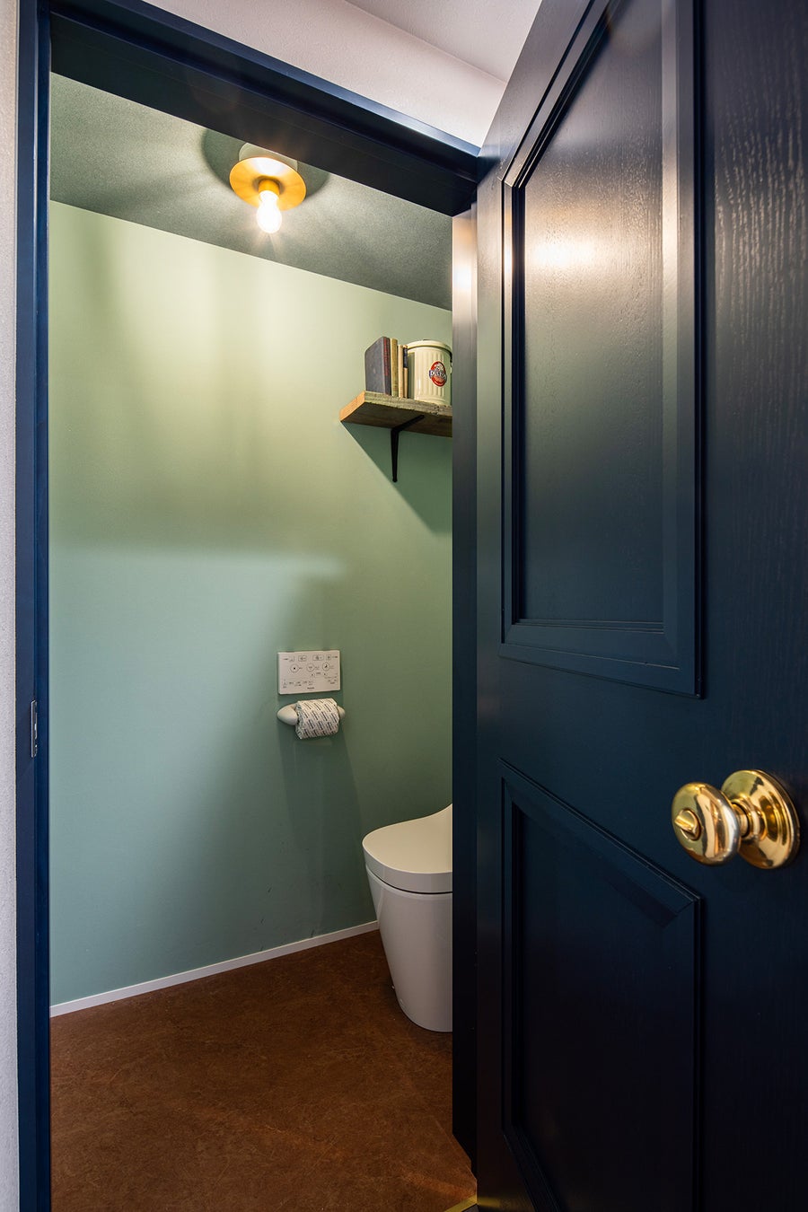トイレはオリジナル塗り壁のグリーンをベースに、飲食店のトイレのようにシックでリラックスできる空間にしました。