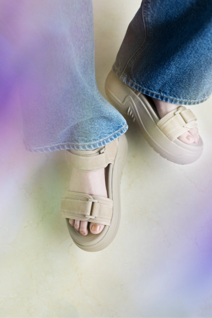そのソールをのせたトータル4型のラインナップは、ブランドの代名詞として人気を誇るNEO BUNGYをプレーンに仕上げたNEO BUNGY EVOL、 ふたつのストラップとレザー調PU&メタルパーツが特長的なCHILL VIBES EVOL、アッパーの素材やディテールをマイナーチェンジしてクワイエットにまとめたNEO BUNGY EVOL CHUNKY、 ワントーンのレザー調ストラップでシックな印象を放つCHILL VIBES EVOL CHUNKYといった珠玉のバリエーションで用意。