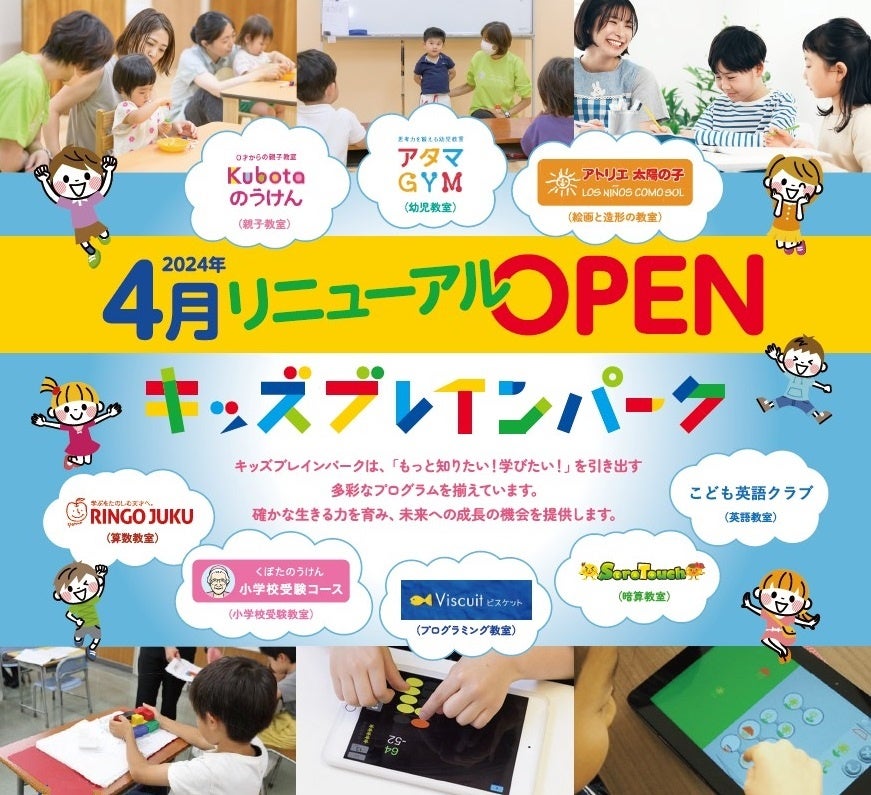 育脳 × STEAM教育の複合型スクールとして、2020年にオープンした「城南ブレインパーク」が、2024年4月より、「キッズブレインパーク」として装いも新たにリニューアルします。「自ら学び・自ら考える子を育てる」という理念はそのままに、"未来”を生き抜く力をつける児童教育の総合型スクールとして、7つあったブランドを13個に増加。「城南ブレインパーク」のメインブランドであった0歳からの育脳教室「くぼたのうけん」が、親子教室「Kubotaのうけん」と幼児教室「アタマGYM」にリニューアルするほか、新たに英語教室「こども英語クラブ」やアート×プログラミング「キッズティンカリング」なども加わります。