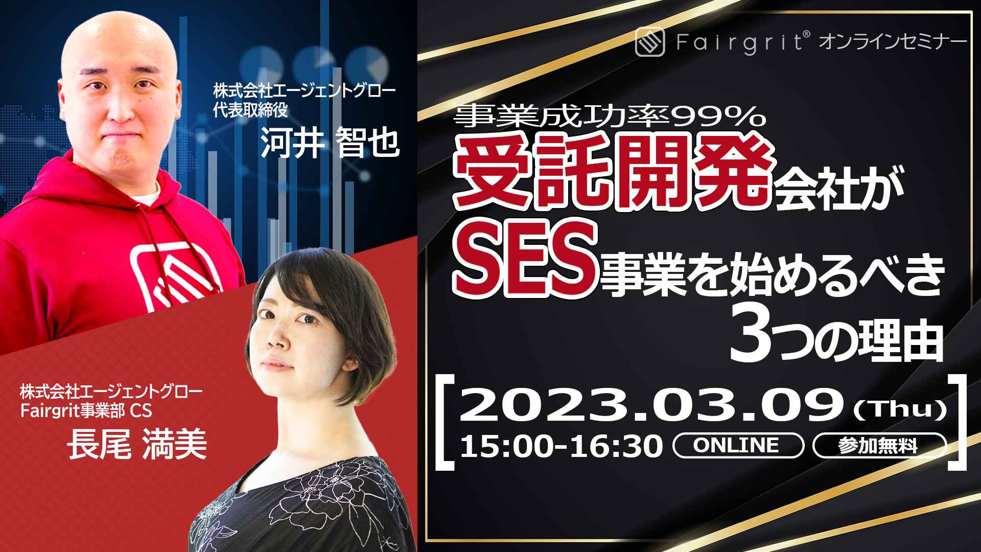 株式会社エージェントグロー(本社:東京都港区、代表取締役:河井智也)が毎月開催している無料オンラインウェビナー。2023年2月度は「事業成功率99%!受託開発会社がSES事業を始めるべき3つの理由」と「急成長中のSES企業の社長たちが贈るぶっちゃけトークバラエティ『SES座談会』」の2本を開催いたします。