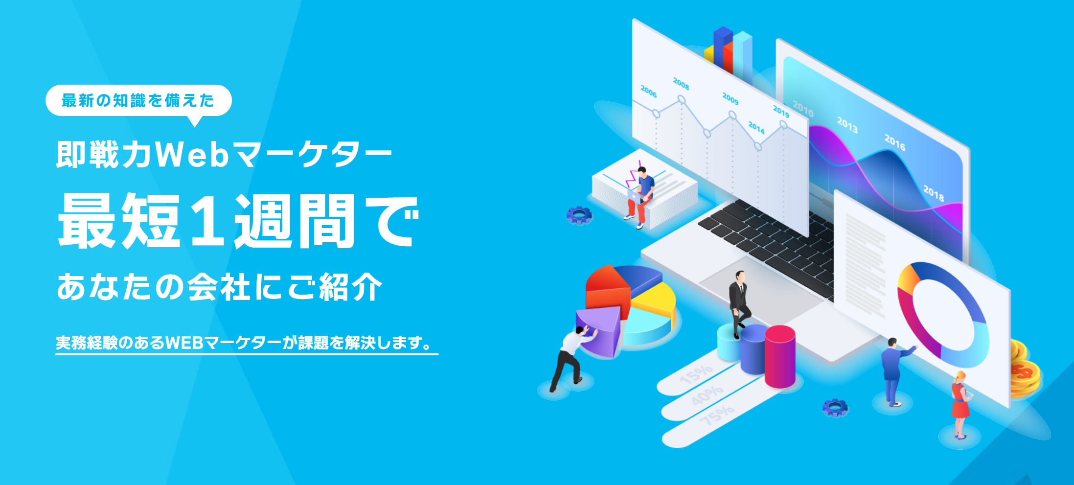 SNS運用やWeb広告、Webサイト運用、マーケティング活動のレポーティング等の現場の実務に対応可能な人材をクライアントの皆様の元に常駐させることで、社内リソースの不足や即戦力人材の必要性といった各企業が抱えるデジタルマーケティング推進にかかる課題解決を行うことができるサービスとなります。