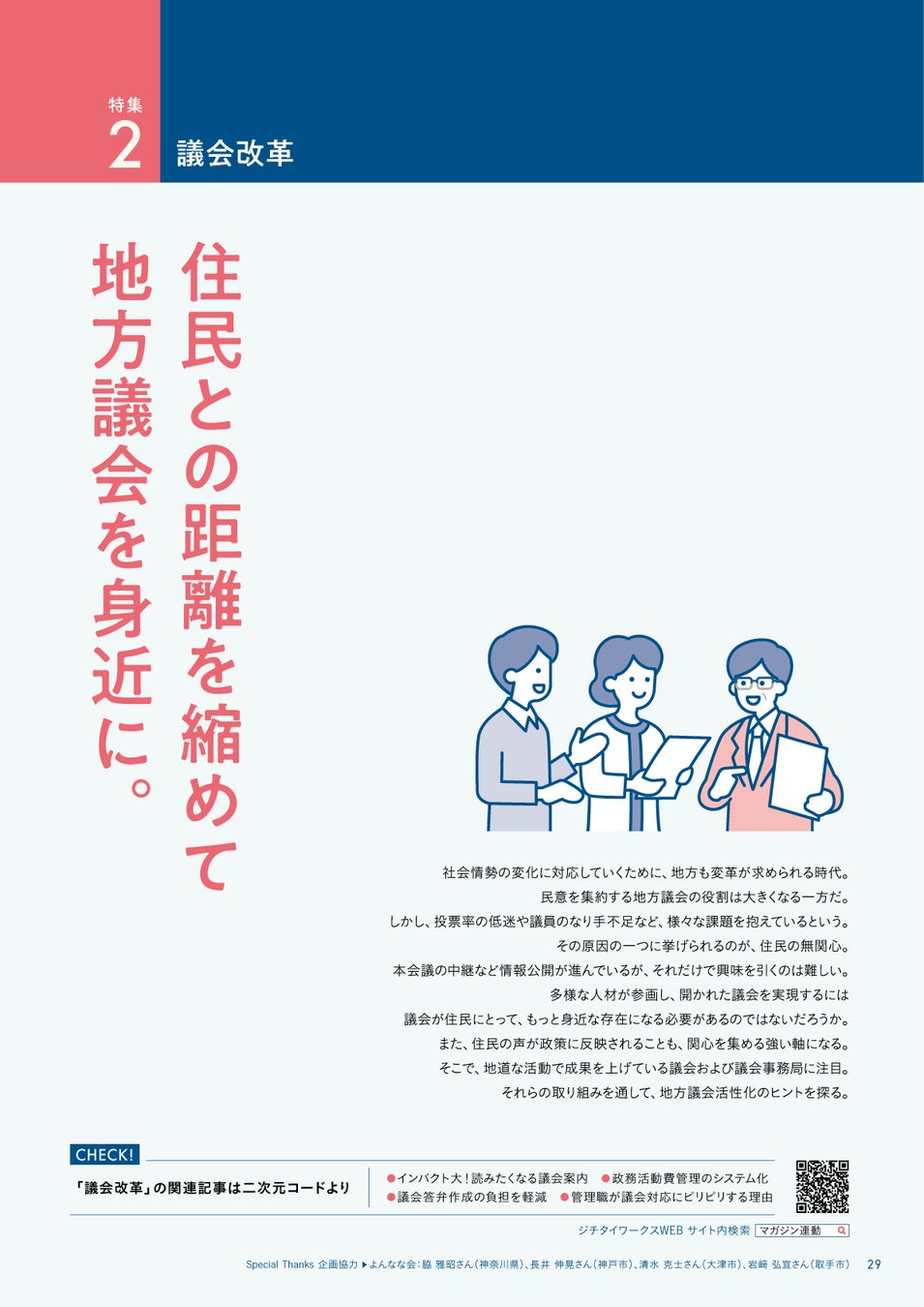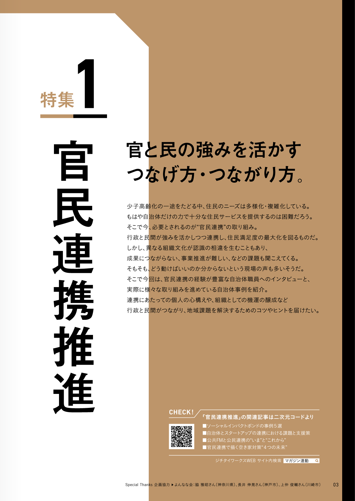 今号の特集1では、「[官民連携推進]官と民の強みを活かすつなげ方・つながり方。」をテーマに、現役公務員インタビューや、三重県桑名市の取り組みをご紹介しております。特集2では、「[議会改革]住民との距離を縮めて地方議会を身近に。」をテーマに、神奈川県開成町、埼玉県寄居町、岩手県奥州市の取り組みをご紹介しております。