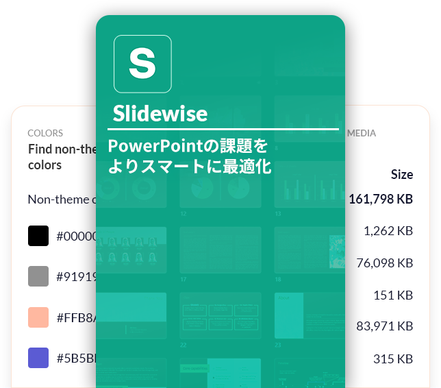 「Slidewiseは、革新的なパワーポイント効率化ツールです。パワーポイント資料の作成において、貴重なインサイト機能、重要なアラート機能、そして強力な自動化機能を提供します。重大なミスやエラーの可能性を事前に検出し、頻出する課題を自動で修正することで、大幅な時間の削減と高品質な資料の維持を同時に実現します。