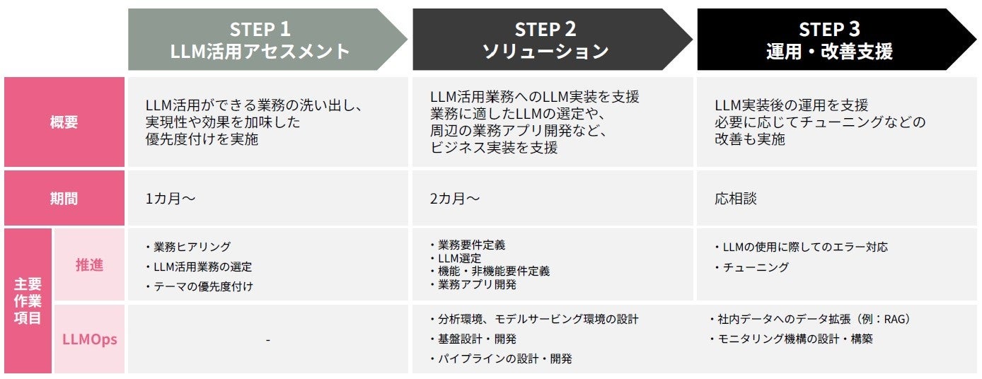LLMをビジネス活用するために必要なアセスメントから運用まで一気通貫でご支援します。