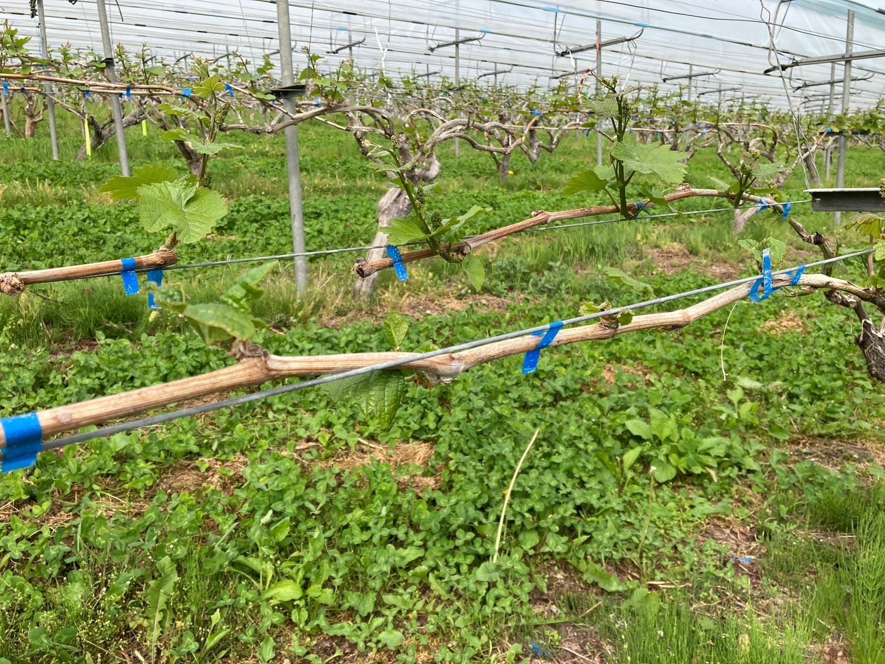 日最低気温はほぼ平年並みの一方、日最高気温は3月中旬から5月中旬にかけて平年を上回り、平均気温も平年を上回る暖かい日が続き、発芽・展葉は平年より早く進みました。この時期は剪定、施設に絡みついた巻き蔓の除去、粗皮剥ぎ、施設の補修など、発芽に向けての準備、発芽後に芽の間引きや雨避けビニールを張る作業を行います。