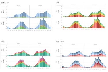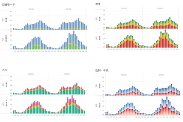 移動手段(徒歩・自転車・自動車)や速度、移動方向、性年代ごとの時間帯別通行量を、平日・休日に分けて把握することが可能です。