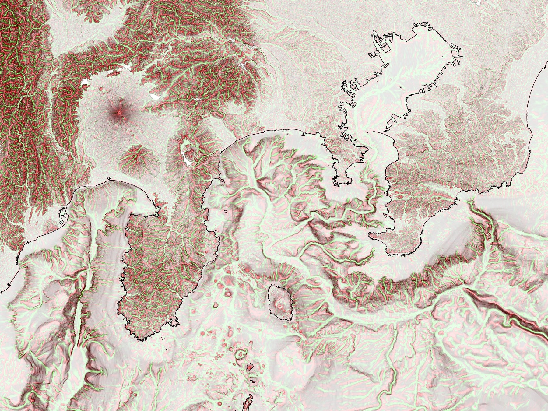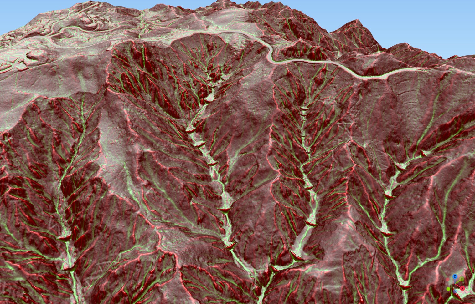 そこで、凹地形の中の微細な地形を可視化したいという想いから、尾根・谷をシャープに抽出し、なおかつ凹地内部が暗くならない微地形表現図「CIマップ」を考案いたしました。流水痕や谷頭侵食のような凹地内部にある微地形部分も明るく発色しますので、大きな地形の立体感に埋没しがちな細かな地形を抽出することが可能になります。既往の微地形表現図と比較して、尾根や谷がシャープにかつ鮮明に可視化されます。
