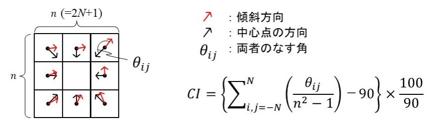 「ある点を中心とする小領域内の、各ピクセルにおける傾斜方向と中心点の方向のなす角θの平均から、90 度を除した値を、さらに100/90 倍したもの」として定義されています。