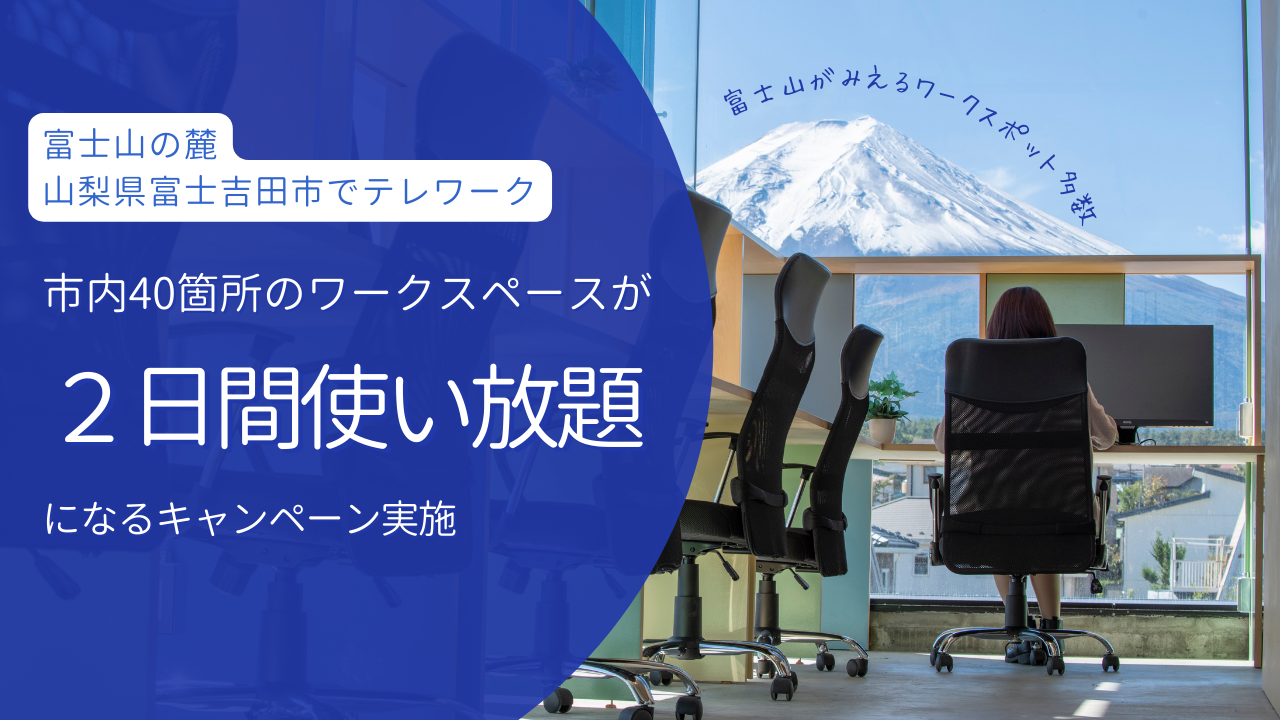 富士吉田市には多種多様なワークスペースが40施設あります。コワーキングスペース、ゲストハウスのラウンジ、カフェなどのデスクワークに適したスペースから、富士急ハイランド、ふじやま温泉、展望スペースなどのワーケーションに適したスペースまで様々です。幅広いワークに対応できるので、富士吉田市にビジネスの拠点を構えている方がお仕事時に利用されたり、東京圏の方がワーケーションのために日帰りで利用されることもあります。これまではそれらのスペースを1日1,800円(税込)でご提供していましたが、「もっと滞在中に様々なワークスペースを利用したい」「富士吉田市に来て1日目は移動時間が多いので、2日間かけて1日分を利用したい」というご要望にお応えし、期間限定ではありますが2日間のご利用料金を1,800円(税込)にてご提供することになりました。通常時の50%引きの価格で変わらないクオリティをご提供します。期間中は何度でもご利用いただけますので、今日はしっかりデスクワーク、来週末はワーケーション、というように様々な用途でご利用ください。