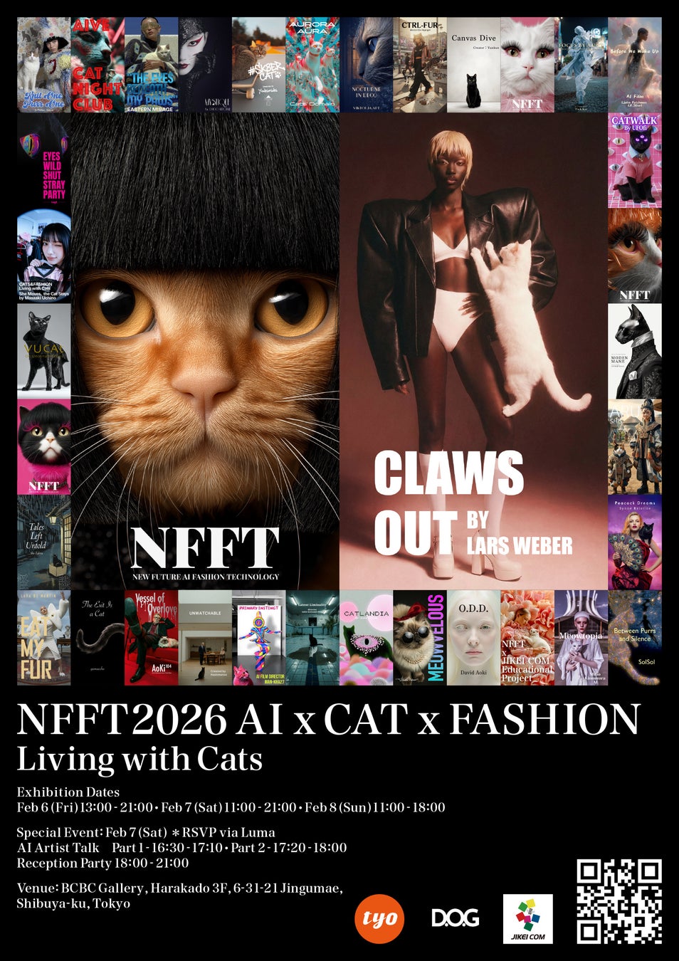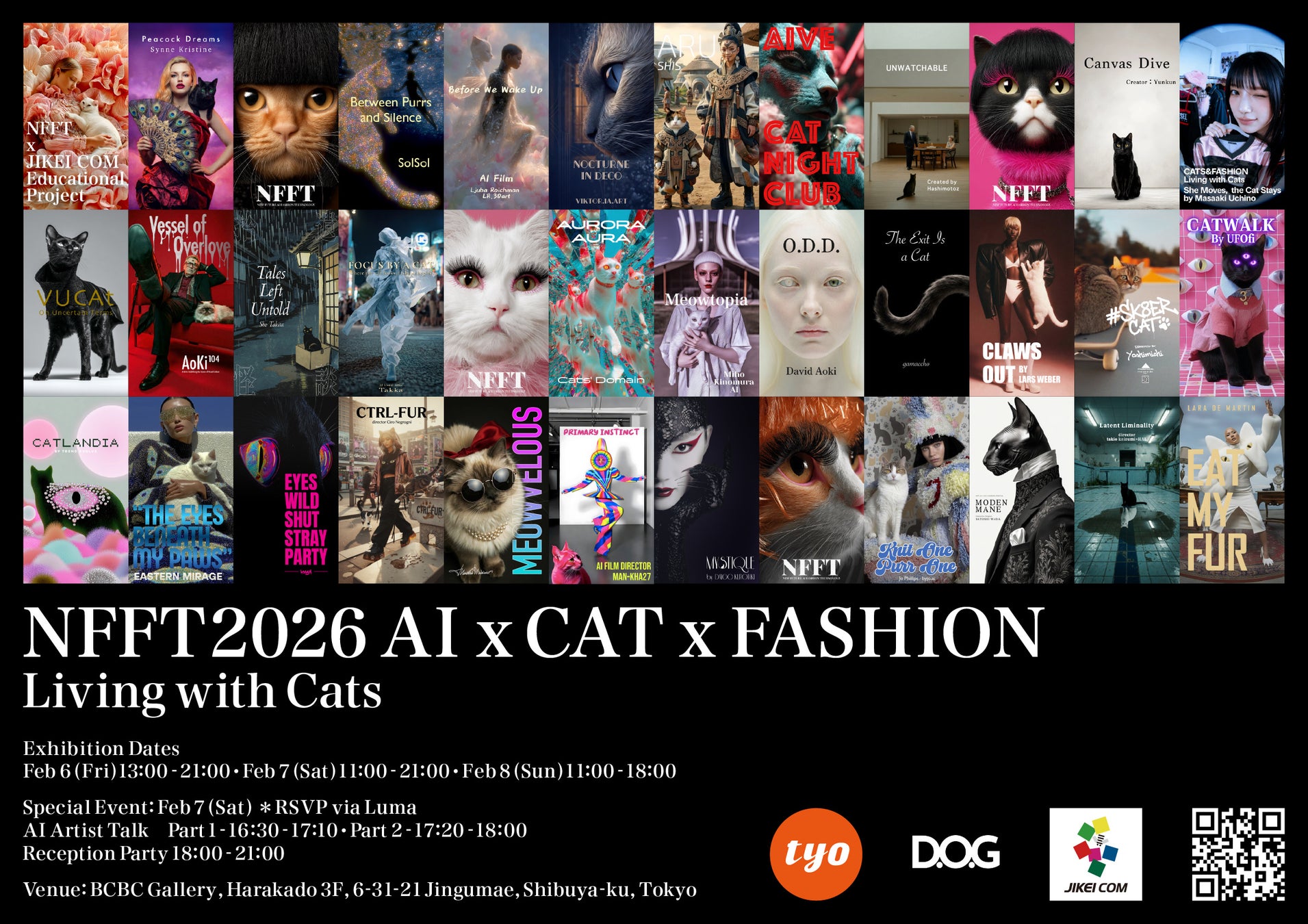 STUDIO D.O.G GK (本社:東京都渋谷区、代表:木之村美穂)は、AIファッションテクノロジーの最前線を発表するプロジェクト「NFFT(New Future AI Fashion Technology)」を、2022年からスタートし、東京やフランスカンヌなどでリアル展示スタイルという発表を続けている、今回は第12回目のAI FASHION MOVIE イベントとして、『NFFT2026_AI x CAT x FASHION Living with Cats -ネコといる暮らし展-』を、2026年2月6日(金)から2月8日(日)の3日間、東急プラザ原宿「ハラカド3階 BABY THE COFFEE BREW CLUB GALLERY 」にて開催いたします。