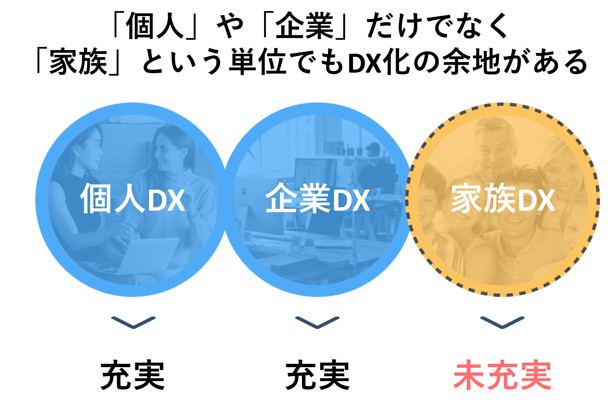 私たちはこうした社会の変容と、現状のテクノロジーの進展を受け、社会を家族単位でDX化していく必要性を感じています。