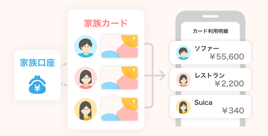 このような背景を踏まえ、戸籍上の関係を問わず、生計を共にしているすべての「家族」を対象として、家族単位でのお金管理をアプリ上で簡単に行える家族カードの発行を開始しました。