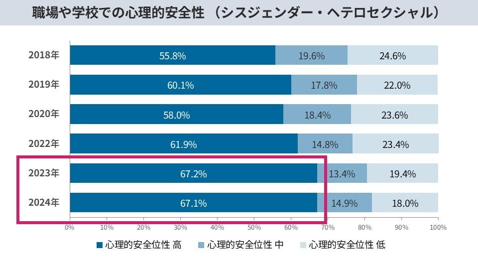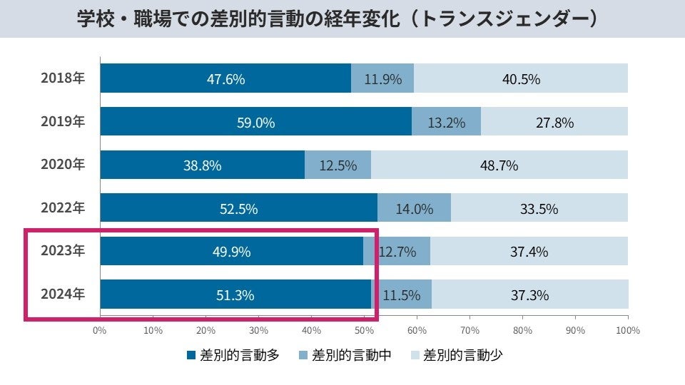 学校や職場での性的マイノリティを取り巻く差別的言動の発生状況について、2018年から2020年にかけては減少傾向にありましたが、2022年から2024年においては、シスジェンダーかつヘテロセクシュアル(以下、非当事者層)を除き、改善が見られないことが明らかになりました。