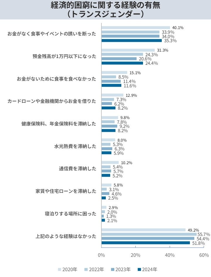 ・トランス女性の約4割弱が年収200万円未満であり、トランスジェンダーの約12%が「お金がなく食事を抜いた経験がある」と回答。非正規雇用や単身世帯が多いこともあり、物価高などの社会不安の影響を直接的に受けていることが明らかに。