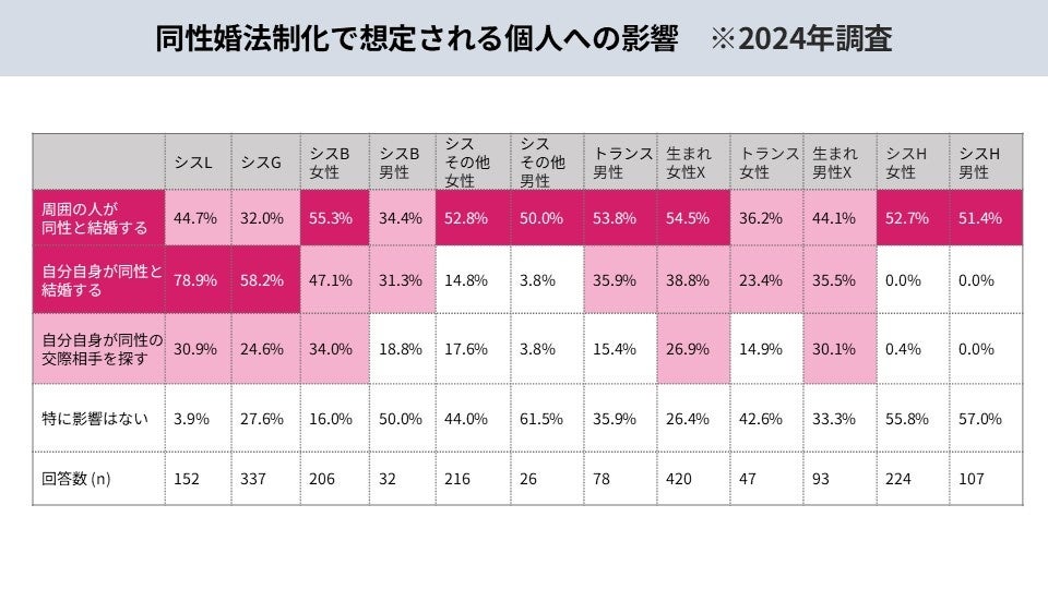 一方で、非当事者層では、法制化したとしても「特に影響がない(56.2%)」という回答が過半数を占めました。「周囲の人が同性と結婚する(52.3%)」という認識はあるものの、法制化を自身の生活において具体的にイメージすることの難しさが伺えます。