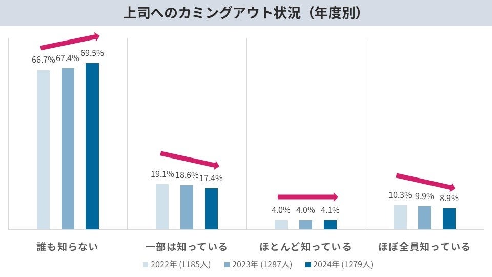 また直近3年間の傾向として、上司へのカミングアウト状況にはほとんど変化が見られませんでした。誰も知らないとの回答が依然として多数派であり、カミングアウトしている場合でも一部の人のみに留まるケースが多くなっています。組織の意思決定層や管理職に対し、安心して対話できる環境が十分に整備されていないことが懸念されます。