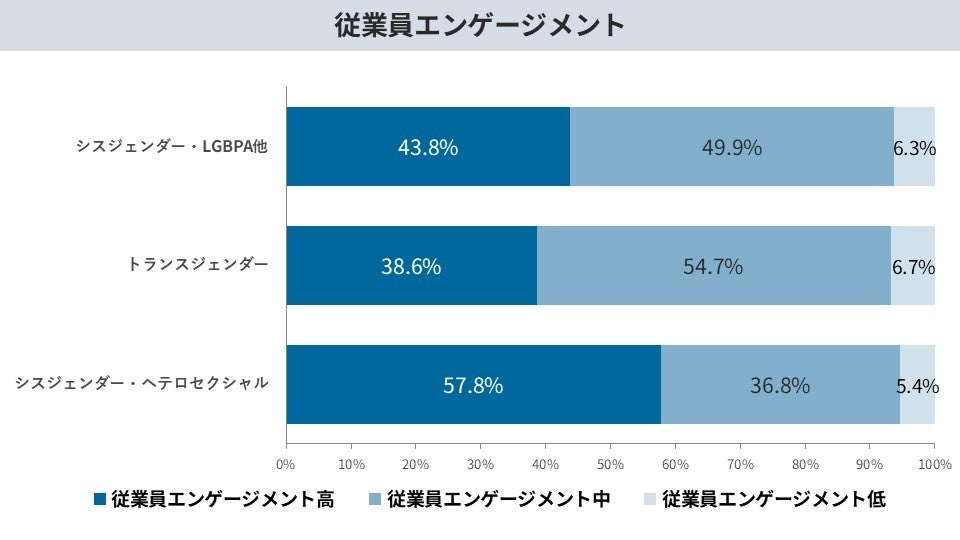 従業員エンゲージメントにおいては、当事者層は非当事者層と比較して低い水準に留まっていることが判明しました。「エンゲージメントが高い」と回答した割合は、シスジェンダーかつヘテロセクシュアル(非当事者)層の57.8%に対し、シスジェンダーのLGB他層で43.8%、トランスジェンダー層では38.6%にまで低下しています。