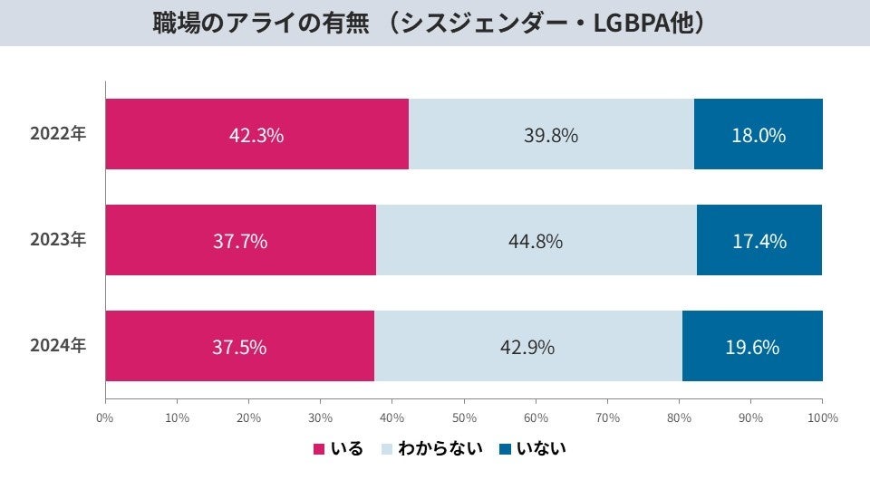 職場におけるアライ(⽀援者)の有無について、2020年から2022年にかけて、当事者層において「アライがいる」の回答は2020年では42.3%のところ2024年では37.5%と減少傾向にあります。トランスジェンダー層においても、2020年は48.2%が2024年は43.3%と減少しています。