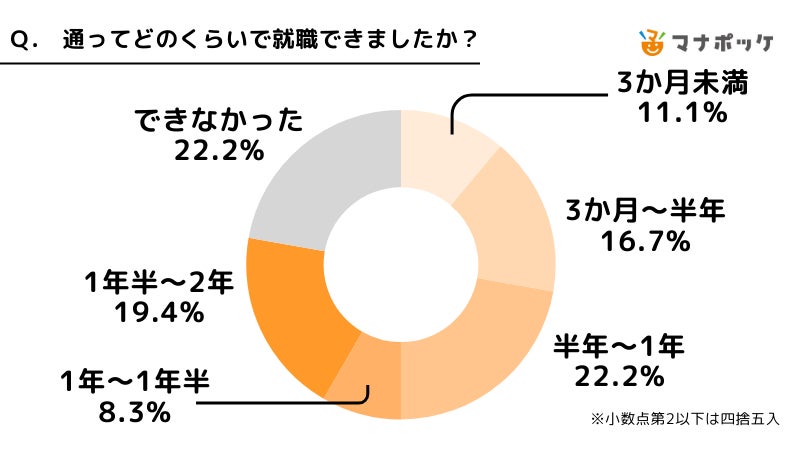 通って「半年~1年」で就職できたと答えた方が最も多い結果となりました。約5割は通所開始から1年以内に就職していることがわかりました。