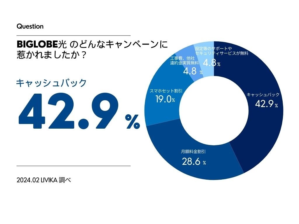 BIGLOBE光のどんなキャンペーンに惹かれたかについて、42.9%の方が「キャッシュバック」と回答しました。