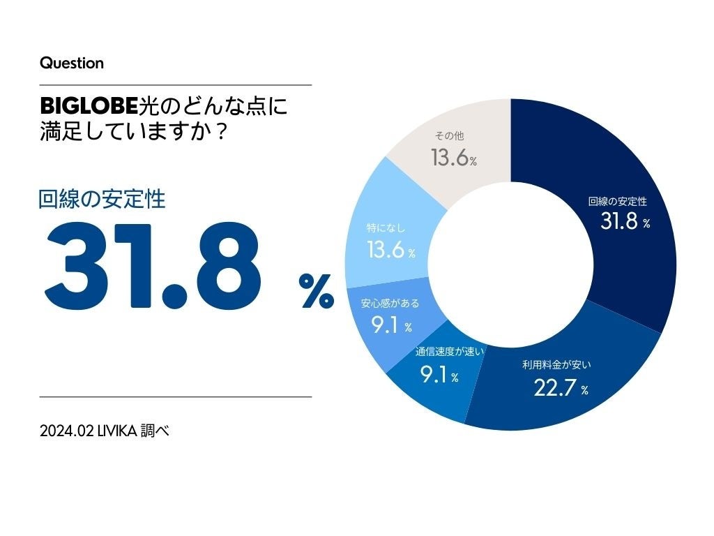 BIGLOBE光のどんな点に満足しているかに関して、「回線の安定性」との回答が最も多く31.8%でした。次いで、「利用料金の安さ」が22.7%との結果となっています。