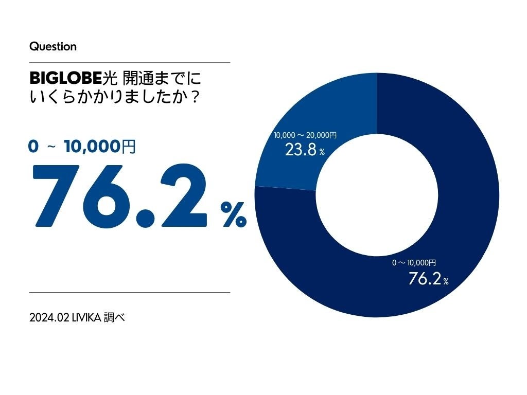 BIGLOBE光開通までにかかった費用について、「0~10,000円」が76.2%となり、「10,000~20,000円」が23.8%となりました。