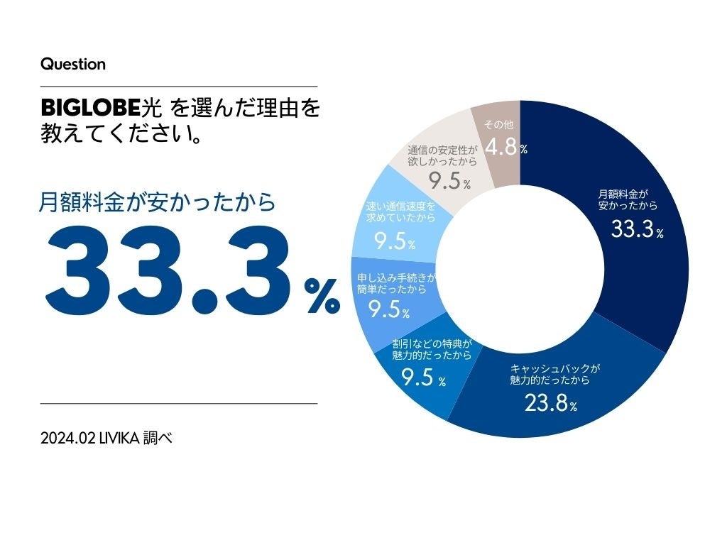 BIGLOBE光の選択理由としては「月額料金が安かったから」(33.3%)が最も多く挙げられました。