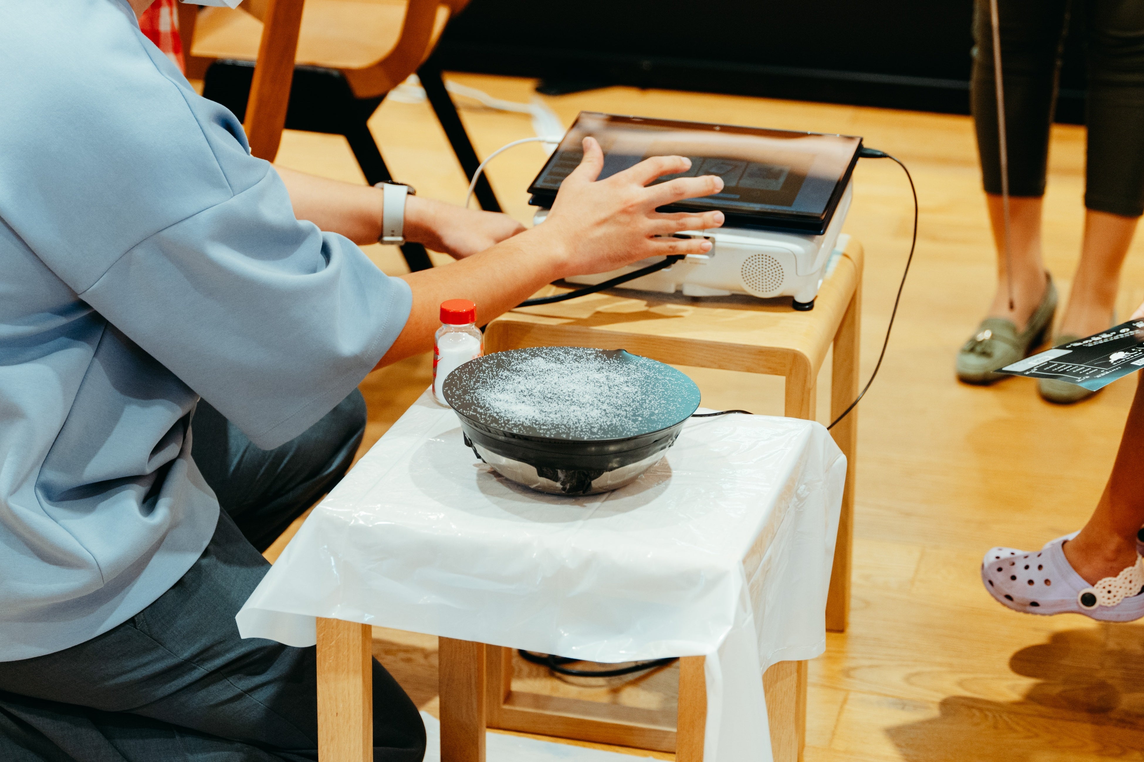 また、音の振動実験では、犬の鳴き声や電話の音、トラックのエンジン音など様々な音が振動する様子に、⼦どもたちだけでなく⼤⼈たちも驚いた様子で「へえー」と声が上がり、音についての説明に熱⼼に耳を傾けている様子からは 、“きこえ”に対する関⼼の⾼さを窺うことができました。