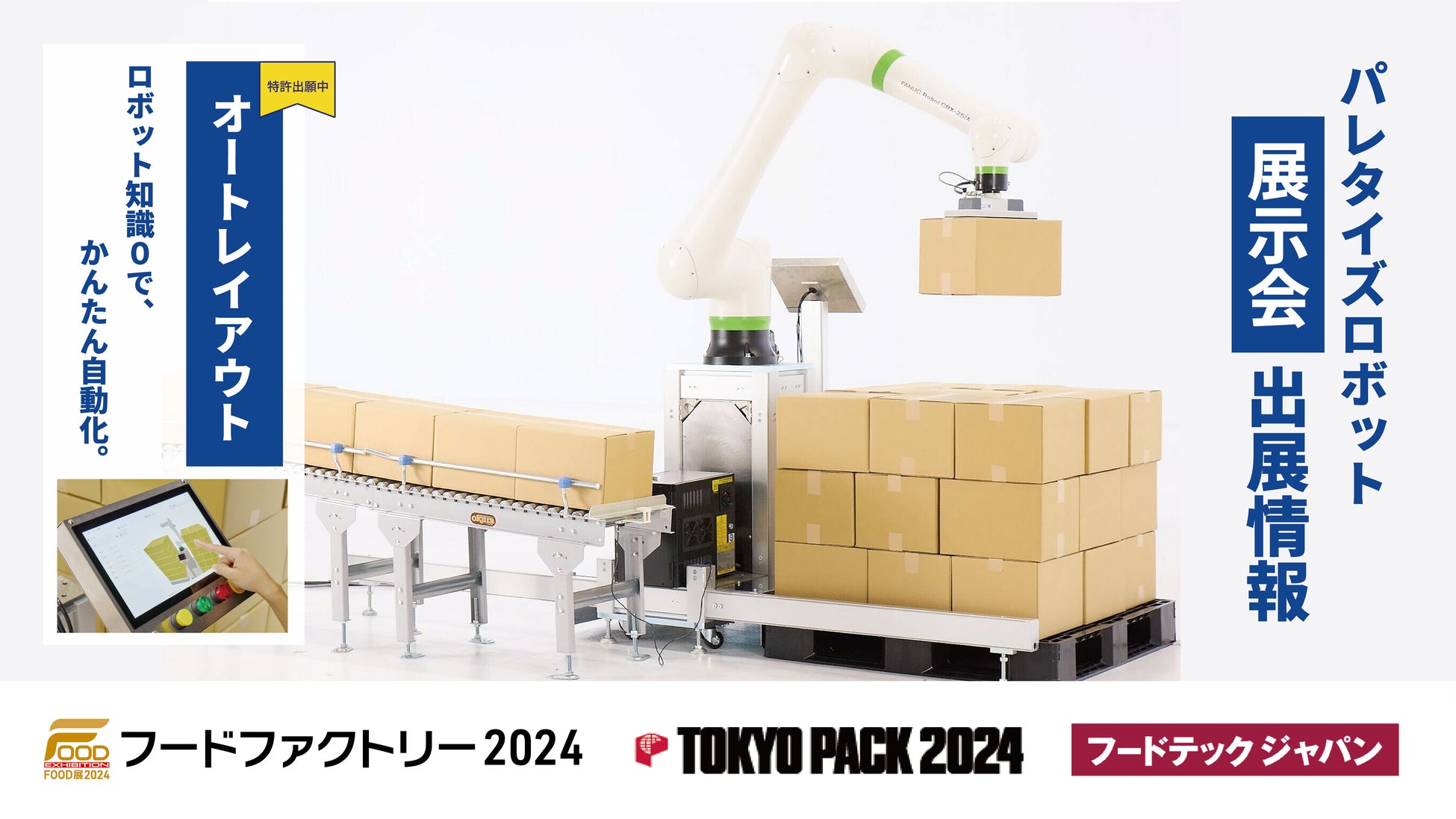 各展示会では、段ボール等の積み付け作業を自動化する小型協働パレタイズロボット「Palletizy(パレタイジー)」及び、食品工場での大変な繰り返し作業を自動化する小袋移載ロボット「PickPacker(ピックパッカー)」を展示します。