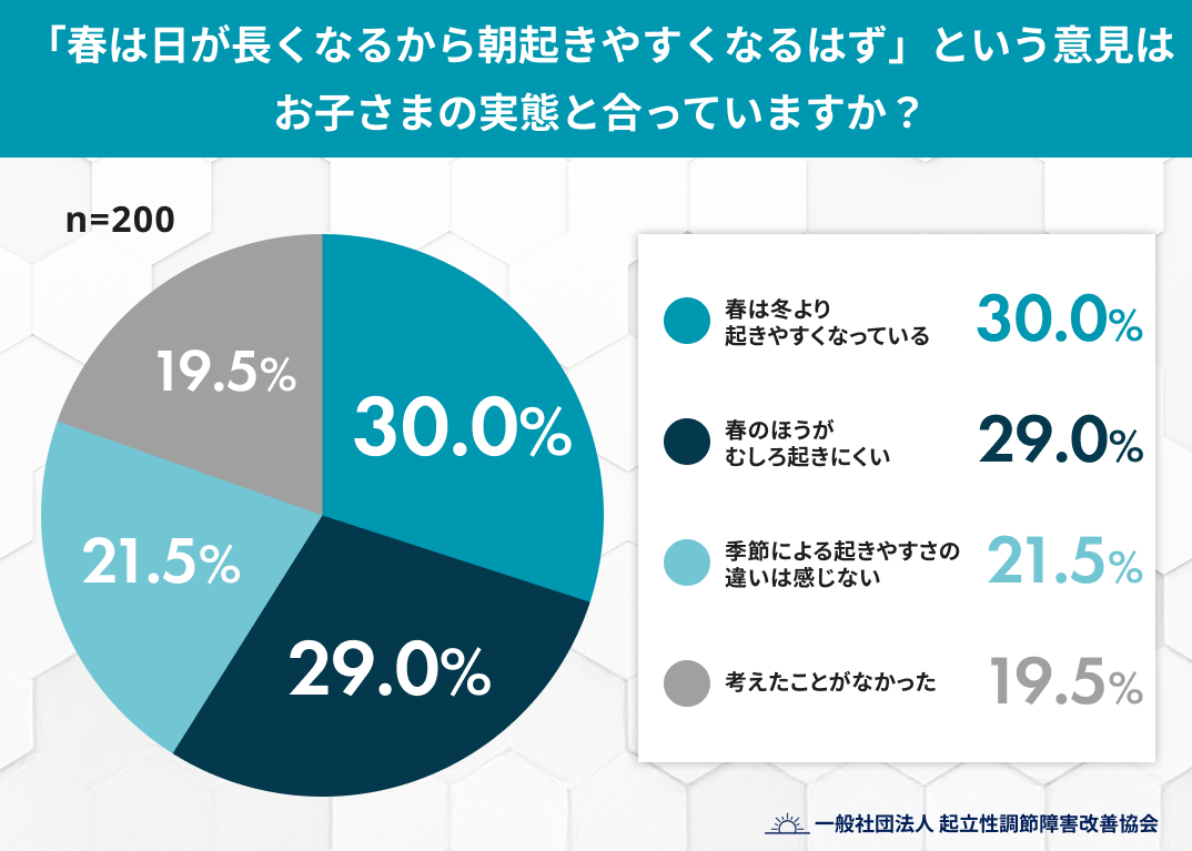 春は新生活への期待が膨らむ一方で、気温差や気圧の変動、環境の変化が重なり、子どもの自律神経が最も乱れやすい季節でもあります。一般社団法人 起立性調節障害改善協会は、小中高生の子どもを持つ保護者200名を対象に「季節の変わり目と子どもの不調」に関する実態調査を実施しました。その結果、7割の保護者が「春に子どもの体調の変化を感じる」と回答。特に「春は日が長くなり起きやすくなる」という通説に反し、約3割が「春のほうがむしろ起きにくい」と感じている実態が浮き彫りになりました。春特有の不調の背景にある、身体疾患「起立性調節障害(OD)」の可能性と、季節要因への理解の重要性を提示します。