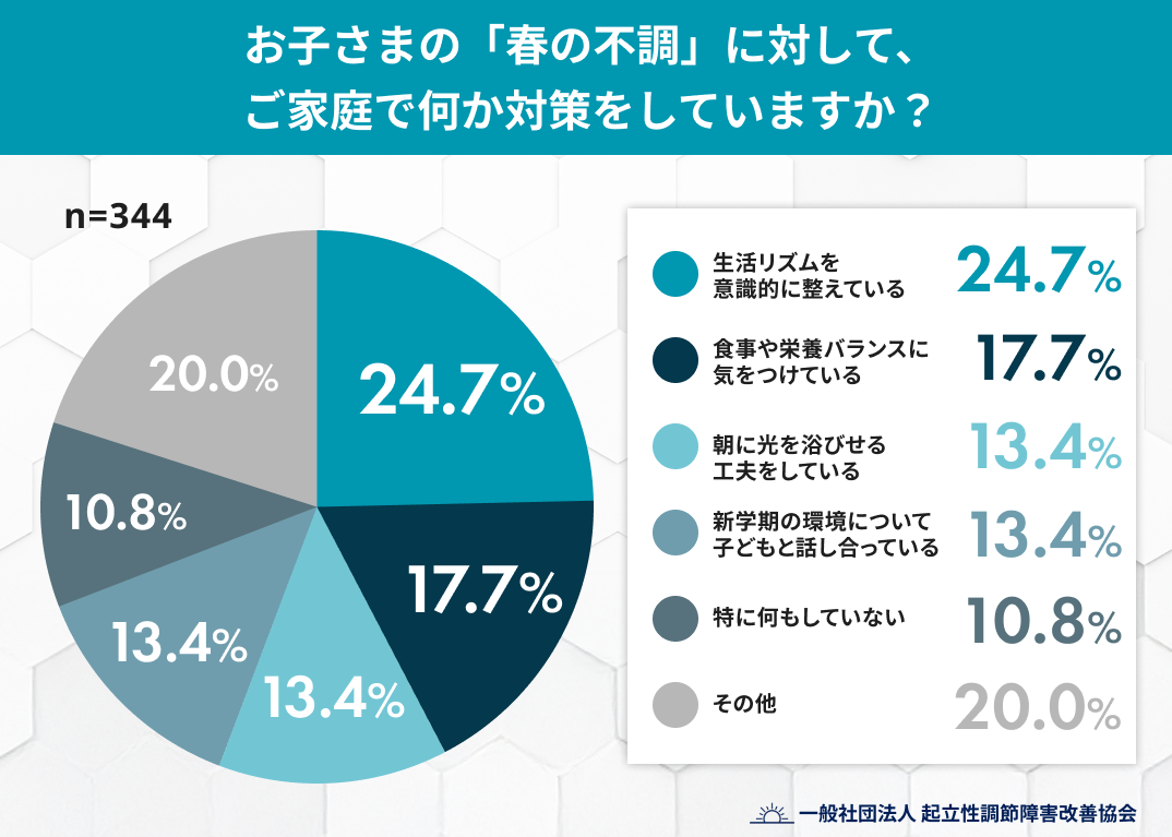 → 約3割の保護者が「環境変化によるストレス」を最大の要因と考えています。一方で、花粉症や寒暖差といった物理的な外的要因を合わせると4割を超えており、精神面と肉体面の両方から負荷がかかりやすい時期であることが浮き彫りになりました。