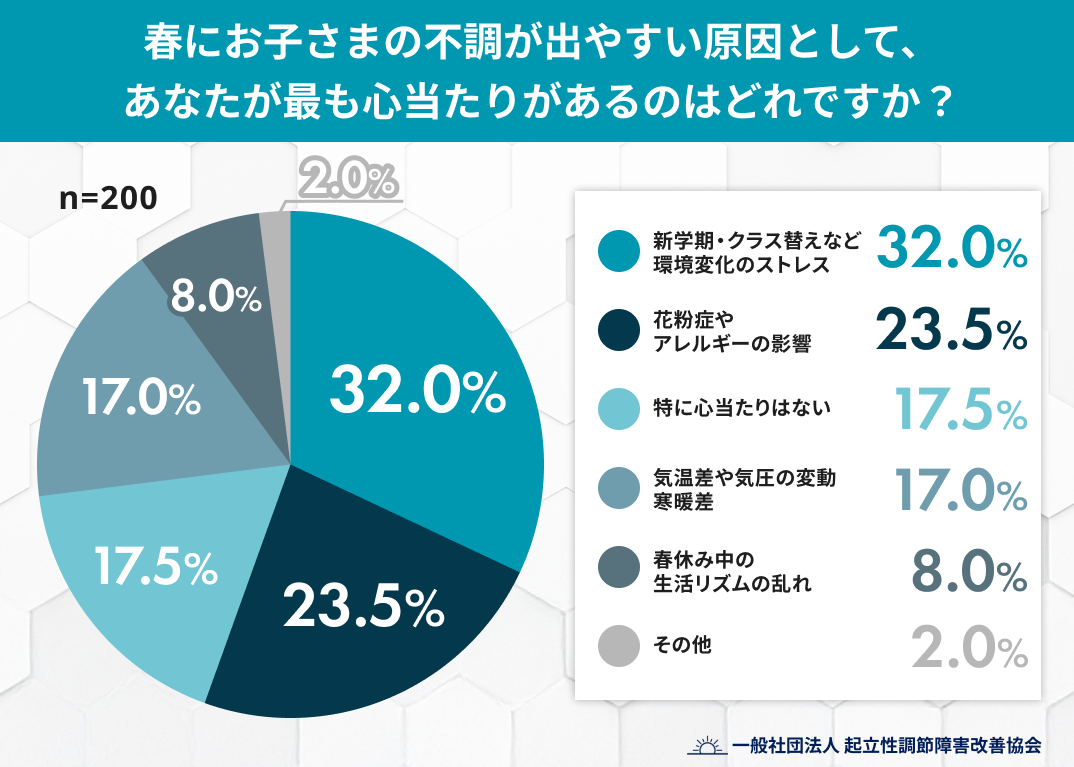 原因の推察: 不調の原因として「新学期の環境変化によるストレス」を挙げる声が32.0%で最多