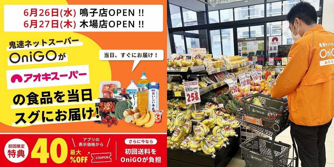 最短20分で生鮮食品や日用品をお届けする、鬼速ネットスーパー「OniGO(オニゴー)」を運営する、ONIGO株式会社(本社:東京都世田谷区、代表取締役:梅下直也、以下 「ONIGO」)は、名古屋市を中心に地域密着型チェーンスーパーを運営する株式会社アオキスーパー(本社:愛知県名古屋市、代表取締役社長:青木俊道、以下「アオキスーパー」)と提携した配達拠点として、アオキスーパー木場店(住所:名古屋市港区木場町2番36号 )、鳴子店(住所:名古屋市緑区上旭2丁目101番地)を追加し、愛知県内での即時配達サービスを拡大します。