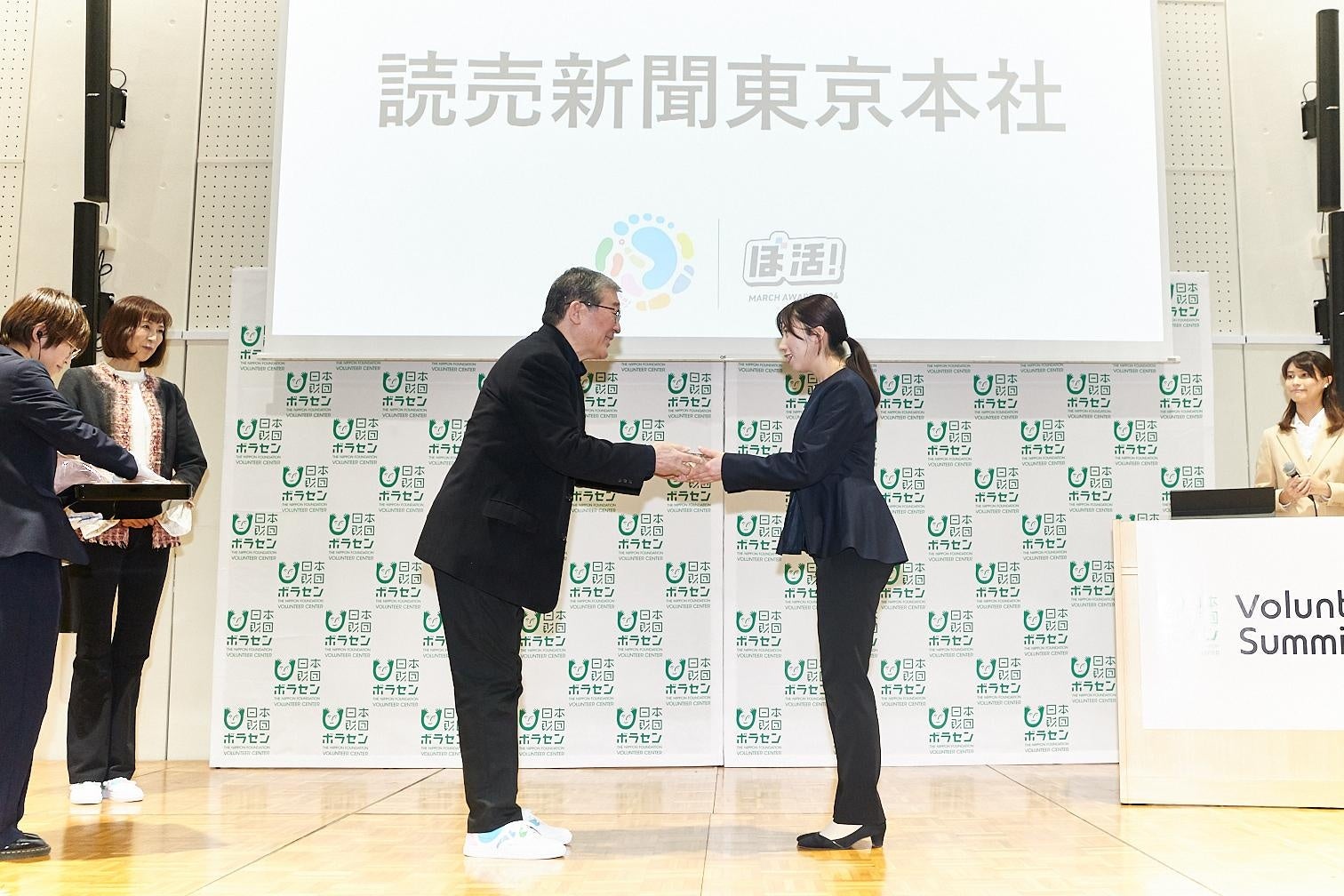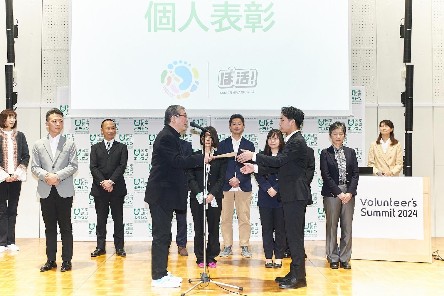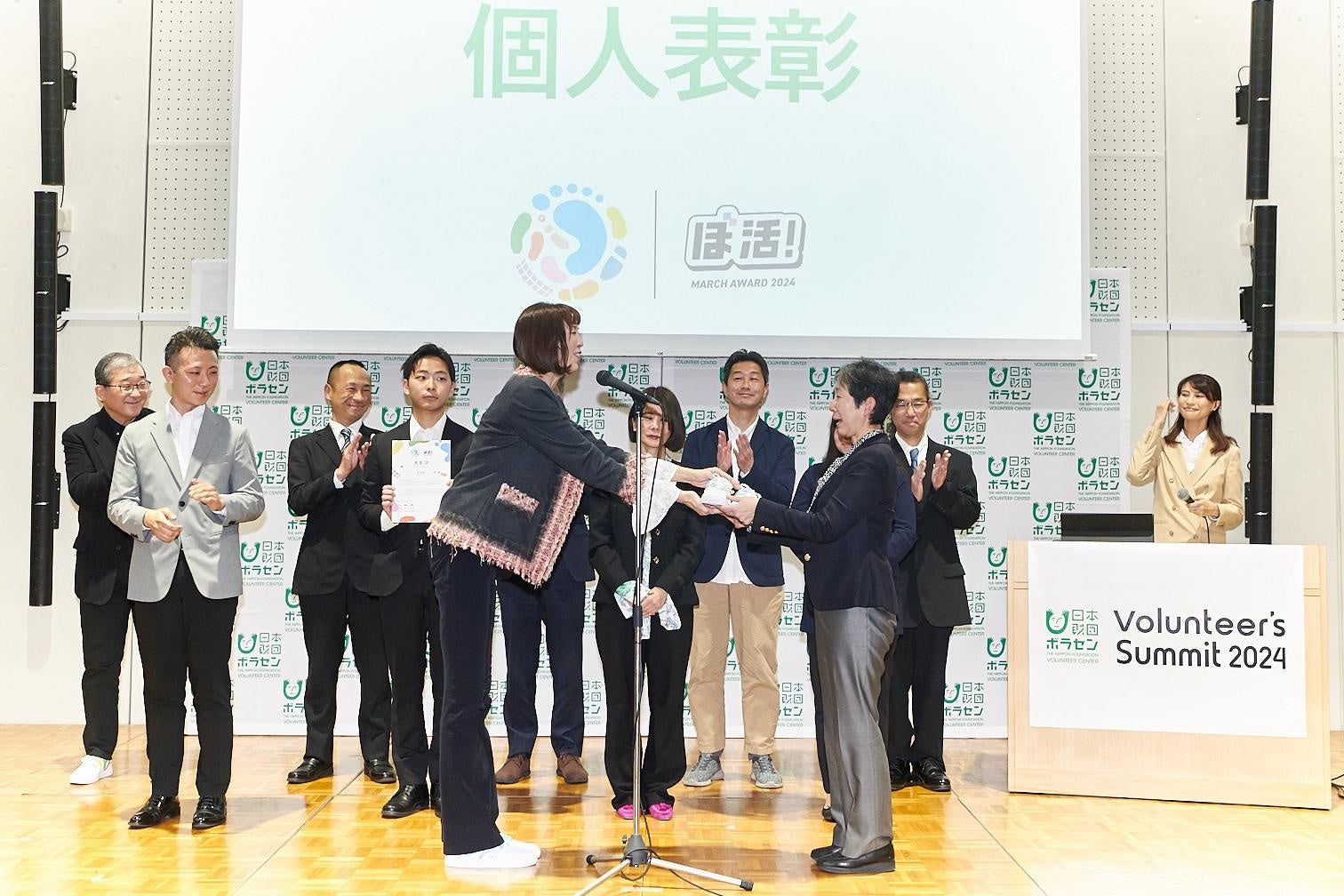 表彰式は、2024年3月2日(土)に日本財団ボラセンが開催したカンファレンス&アワードセレモニー「Volunteer‘s Summit 2024」にて執り行われ、ボランティア表彰選考委員会の二宮雅也委員長(文教大学人間科学部教授、日本財団ボラセン参与)、大林素子さん(女子バレーボール元日本代表、日本財団HEROs)、山脇康会長よりトロフィーや表彰状等が贈られました。