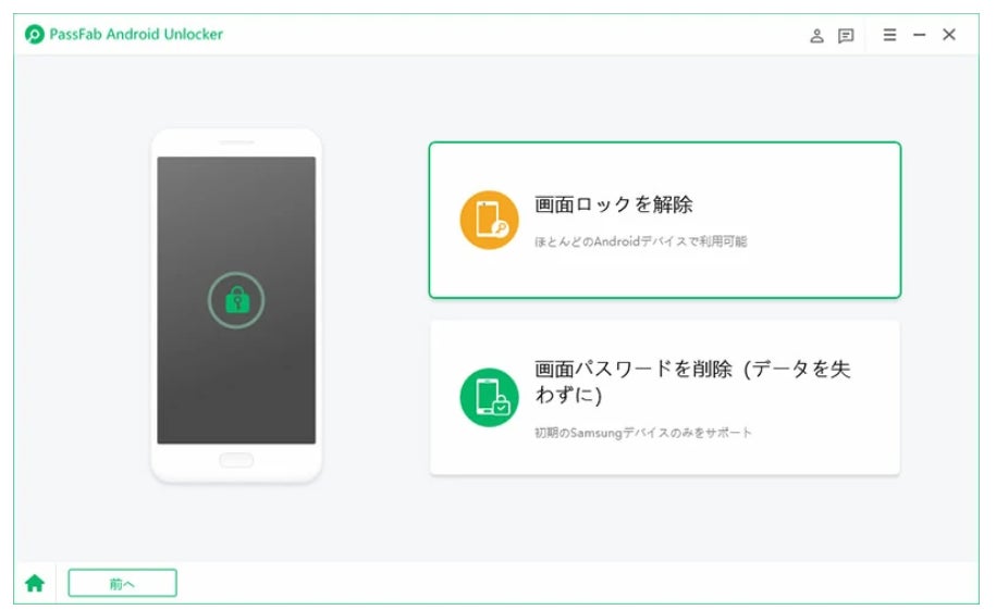 ※一部の初期のSamsungデバイスはPassFab Android UnlockerのWindows版で「画面パスワードを削除(データを失わずに)」からデータを失うことなく画面ロックを解除できます。