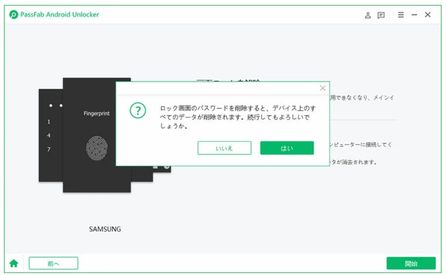 step4:「ロック画面のパスワードを削除すると、デバイス上のすべてのデータが削除されます。続行してもよろしいでしょうか。」と表示されるので「はい」を選択して次に進みます。